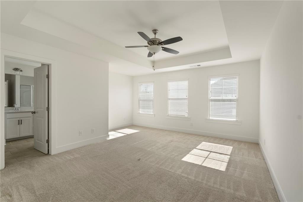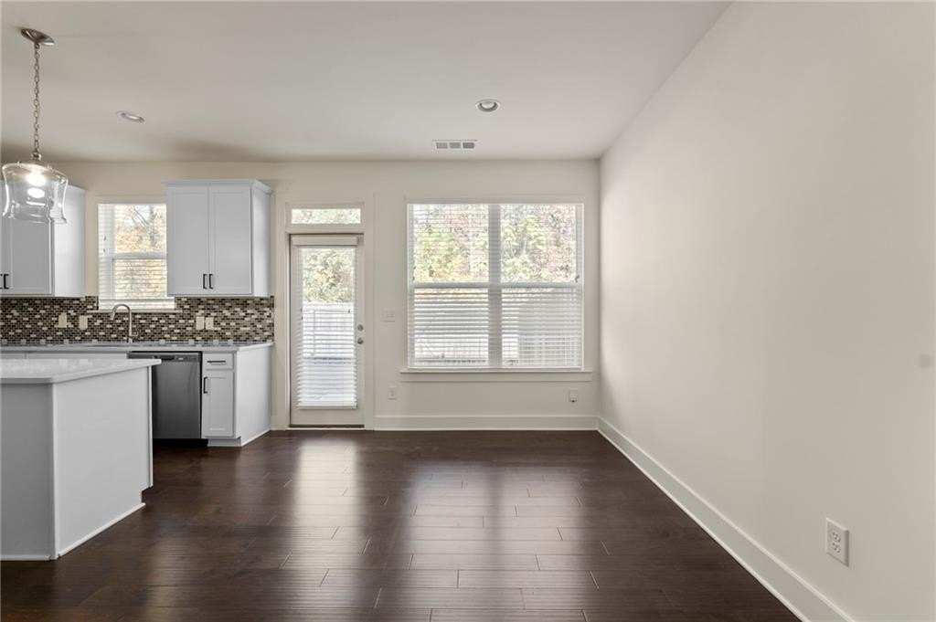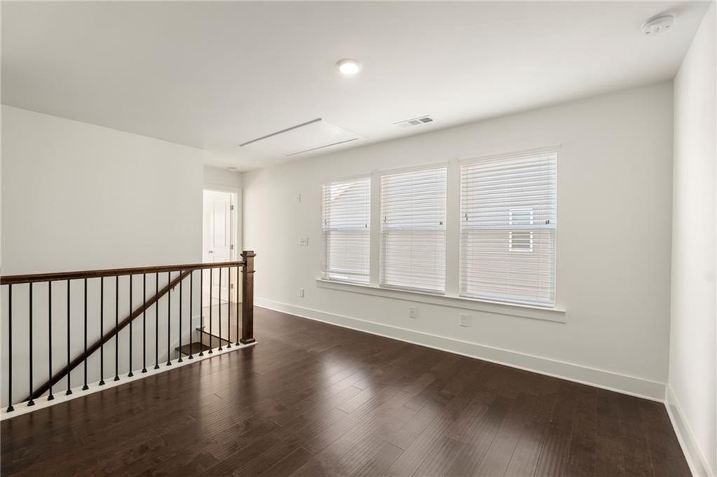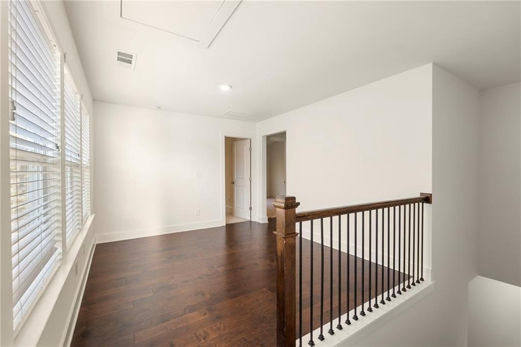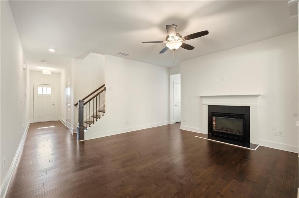 Welcome to this beautifully appointed, move-in ready END-UNIT townhome featuring designer touches and a bright, open layout. One of the most spacious lots in the neighborhood, this 3-bedroom, 2.5-bath residence has been freshly painted and professionally staged to showcase its modern aesthetic and inviting flow. The main level offers an open-concept living area with gleaming hardwood floors and a sleek kitchen complete with quartz countertops, crisp white cabinetry, stainless steel appliances (including a side-by-side refrigerator), and ample counter space. Upstairs, a large hardwood loft provides a versatile flex area, ideal for a second living room, home office, or playroom. The luxurious primary suite includes a walk-in closet, dual vanity, and a separate soaking tub and shower. Two additional spacious bedrooms and a full bath complete the upper level. Additional highlights include a 2-car garage plus driveway parking for two more vehicles, and a fully fenced backyard perfect for pets or outdoor entertaining. Located in a well-kept newer community in Lithonia, just minutes from I-20, Covington Highway, shopping, and grocery stores. Lawn care is included through the HOA for easy living.