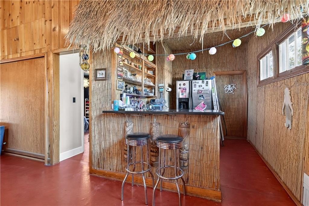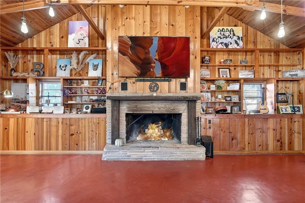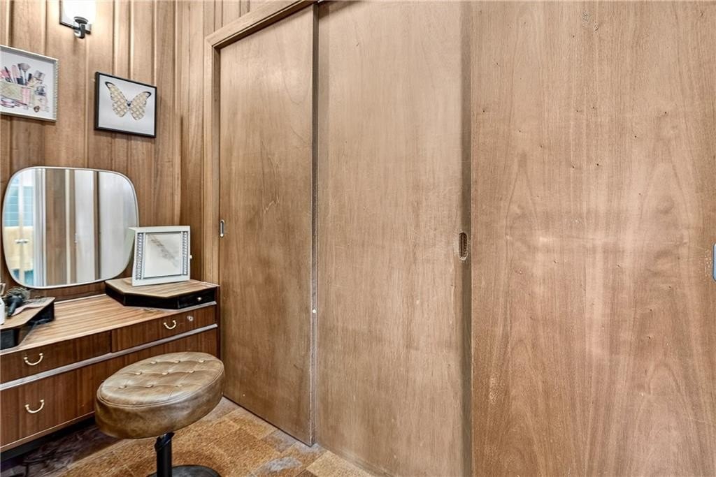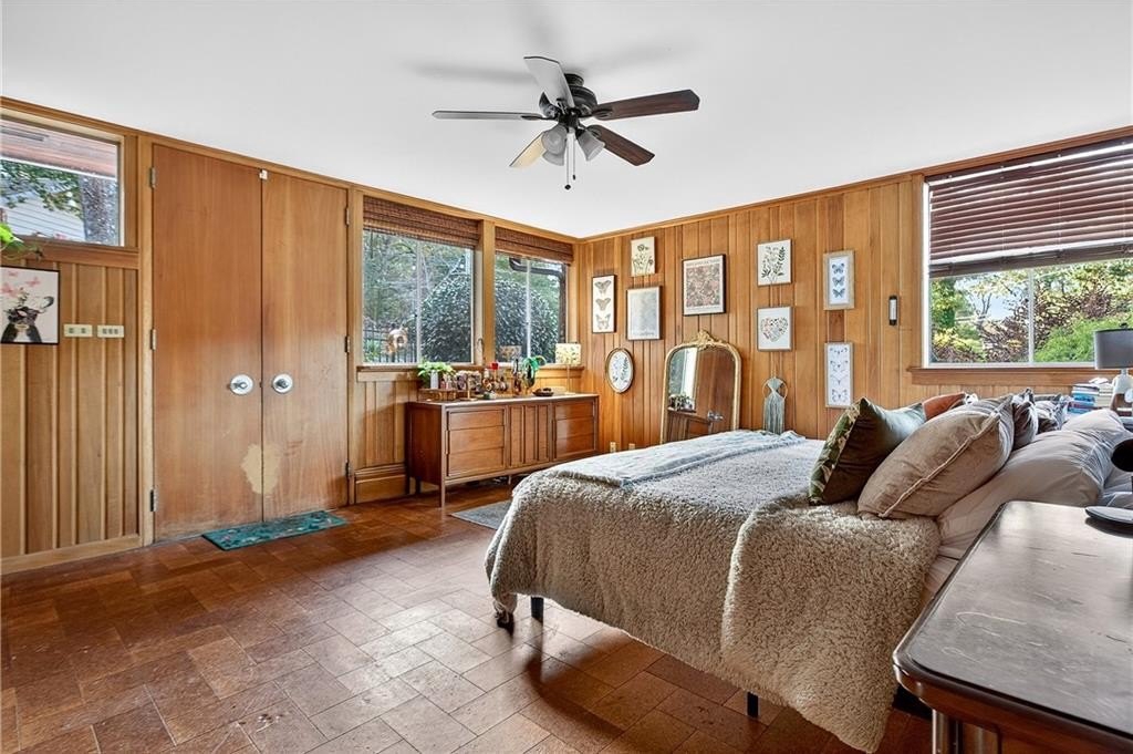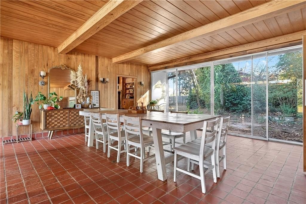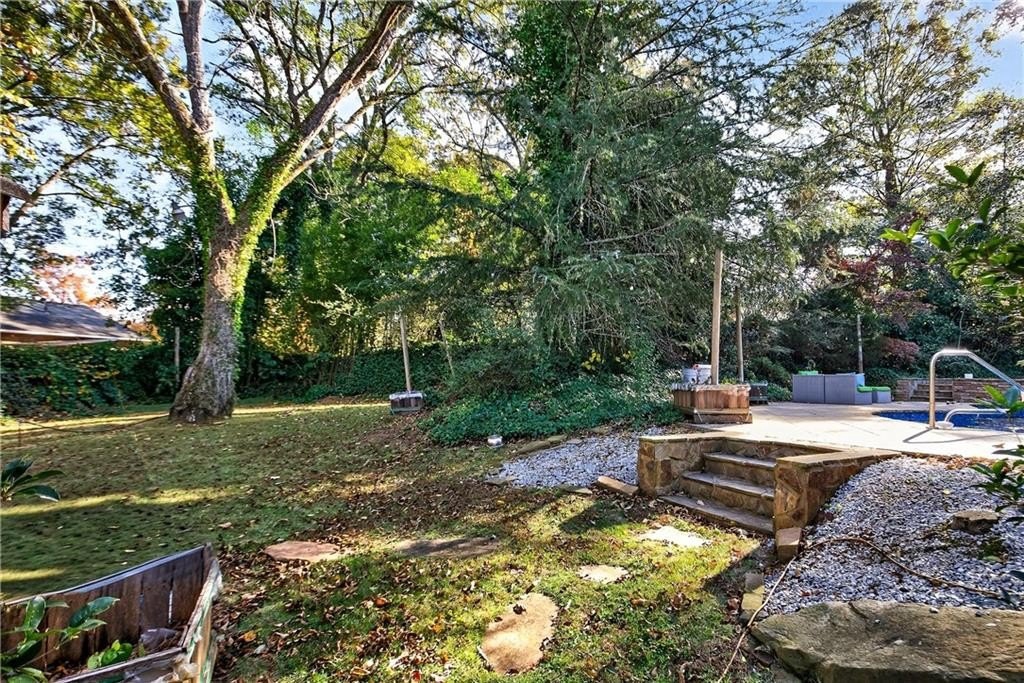A rare architectural masterpiece on 1.5 private acres, this mid-century ranch was designed by renowned architect Gerald L. Bilbro and inspired by Frank Lloyd Wright's organic modernism. Offering 4,365 sq. ft., the home features 5 bedrooms, 4 full baths, solid wood paneling, expansive windows, sliding doors, and a dramatic vaulted living room with a huge stone fireplace and hand-quarried Tennessee facade. The flowing layout includes tile, concrete, and hardwood flooring, custom built-ins, and an indoor tiki bar perfect for entertaining. Just off the main living areas, an expansive open-air patio offers built-in stone seating that wraps the entire space, creating a natural gathering spot shaded by surrounding mature trees. The resort-style 38,000-gallon pool (with new liner), dual waterfalls, and adjoining hot tub provide additional outdoor enjoyment. A detached garage, generous circular driveway, and wide open yard areas add convenience and flexibility. This one-of-a-kind Hampton estate blends iconic MCM design, warmth, and exceptional outdoor living.