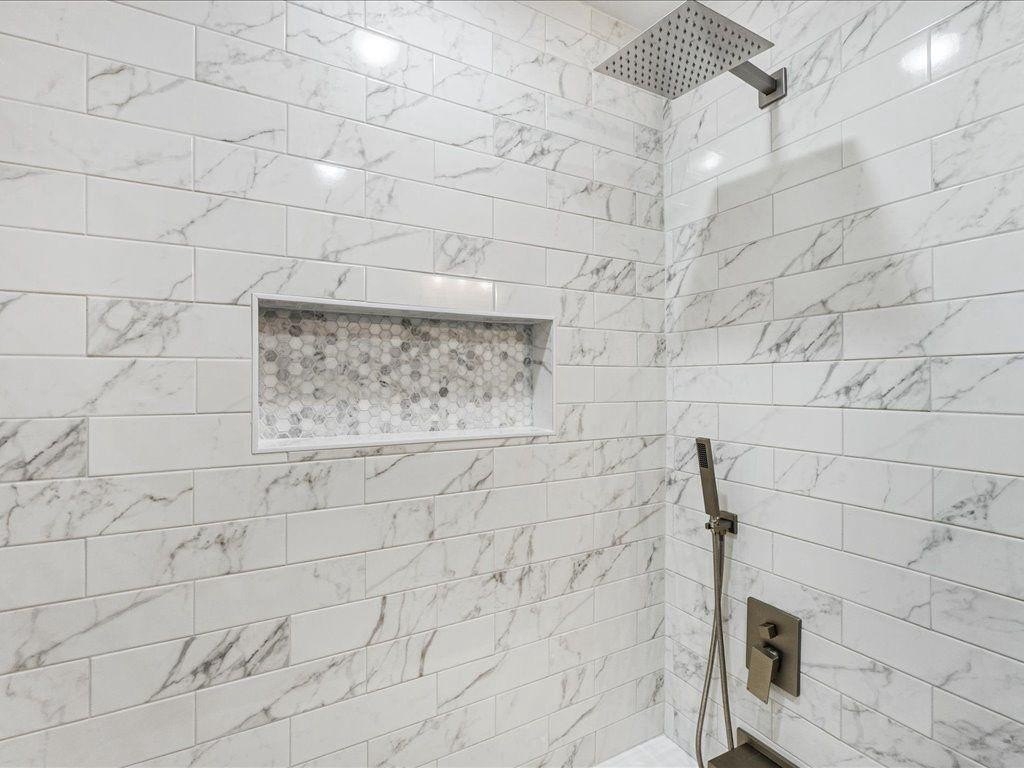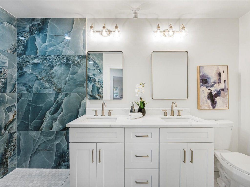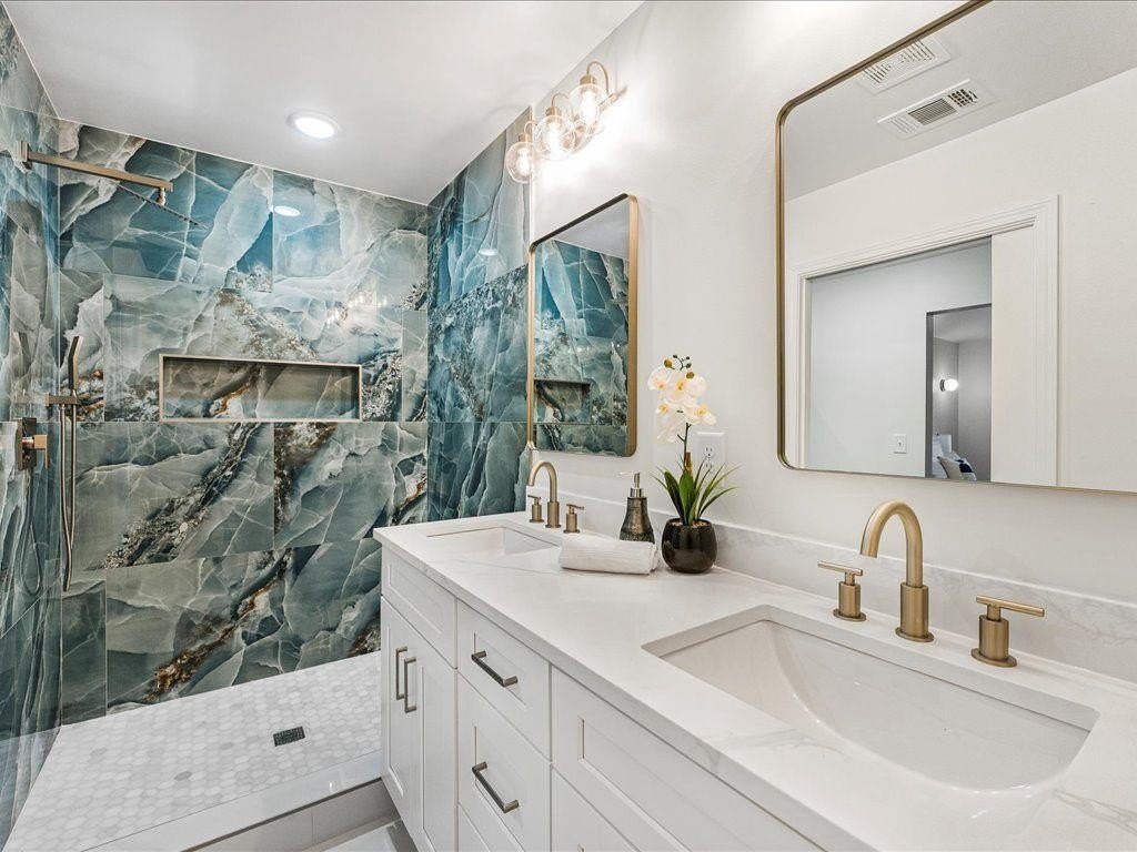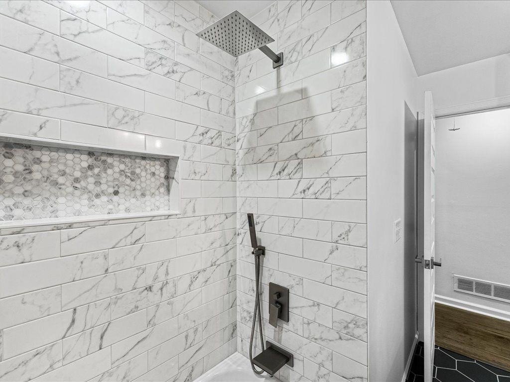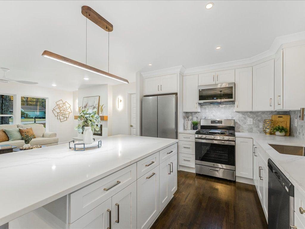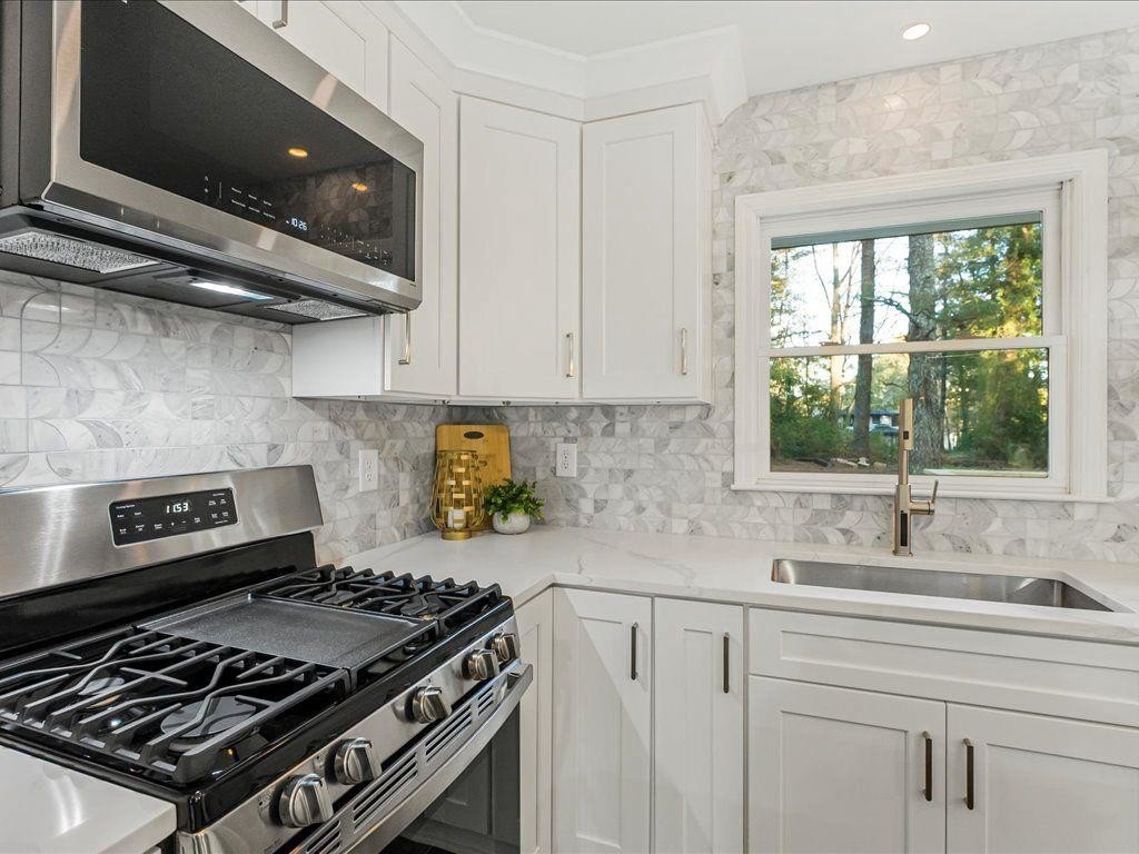 The redesigned kitchen includes quartz countertops, a marble backsplash, stainless steel appliances, and a walk-in pantry closet, providing excellent storage and style. Bathrooms have been fully renovated with modern tile and fixtures.