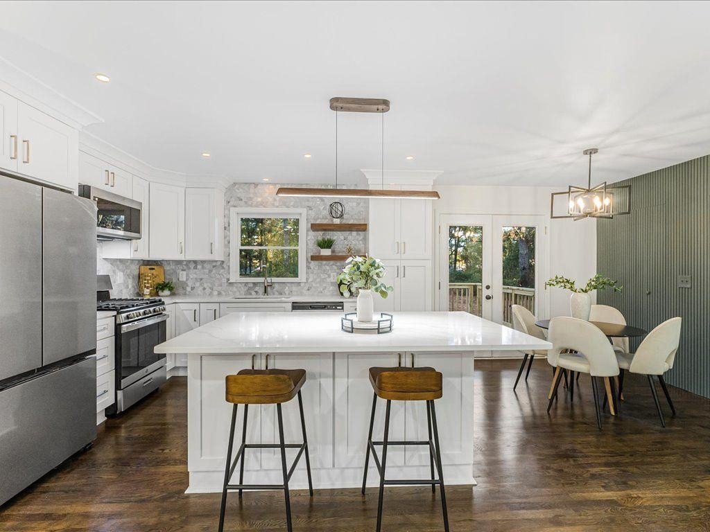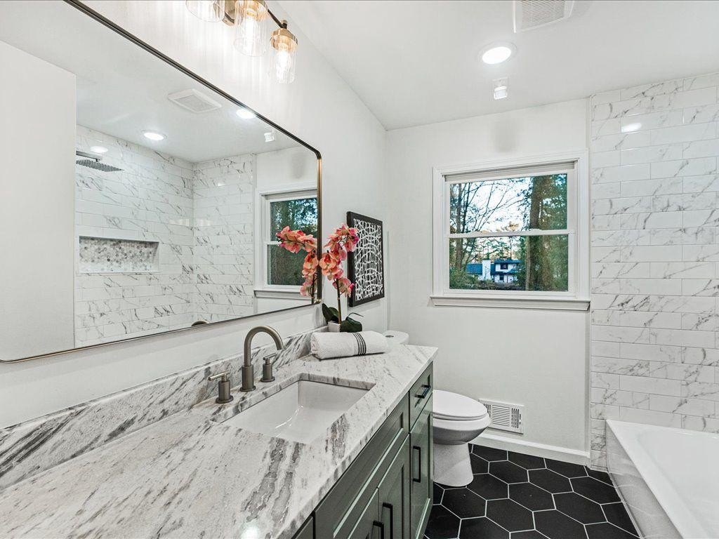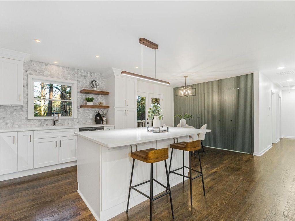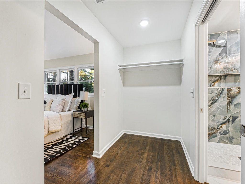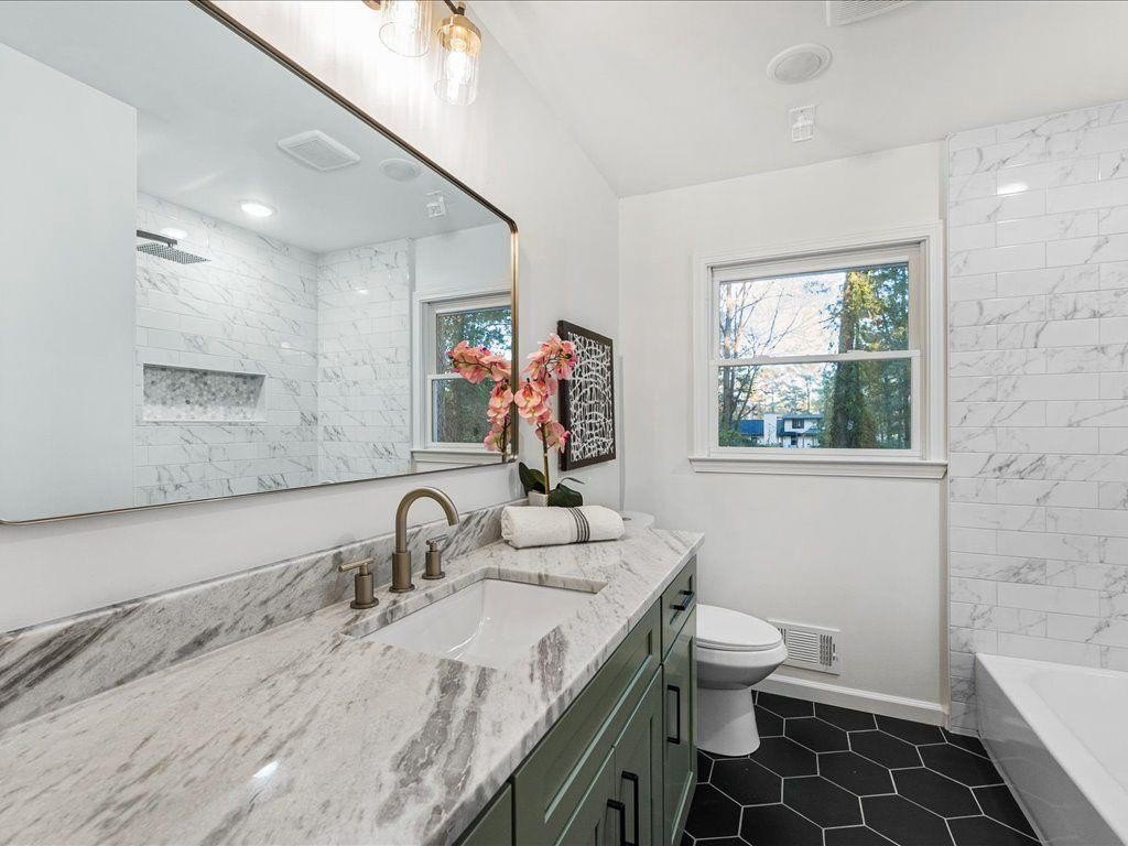 The redesigned kitchen includes quartz countertops, a marble backsplash, stainless steel appliances, and a walk-in pantry closet, providing excellent storage and style. Bathrooms have been fully renovated with modern tile and fixtures.
