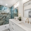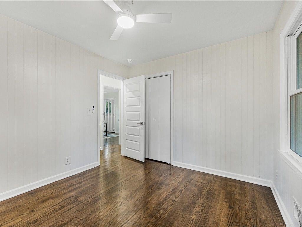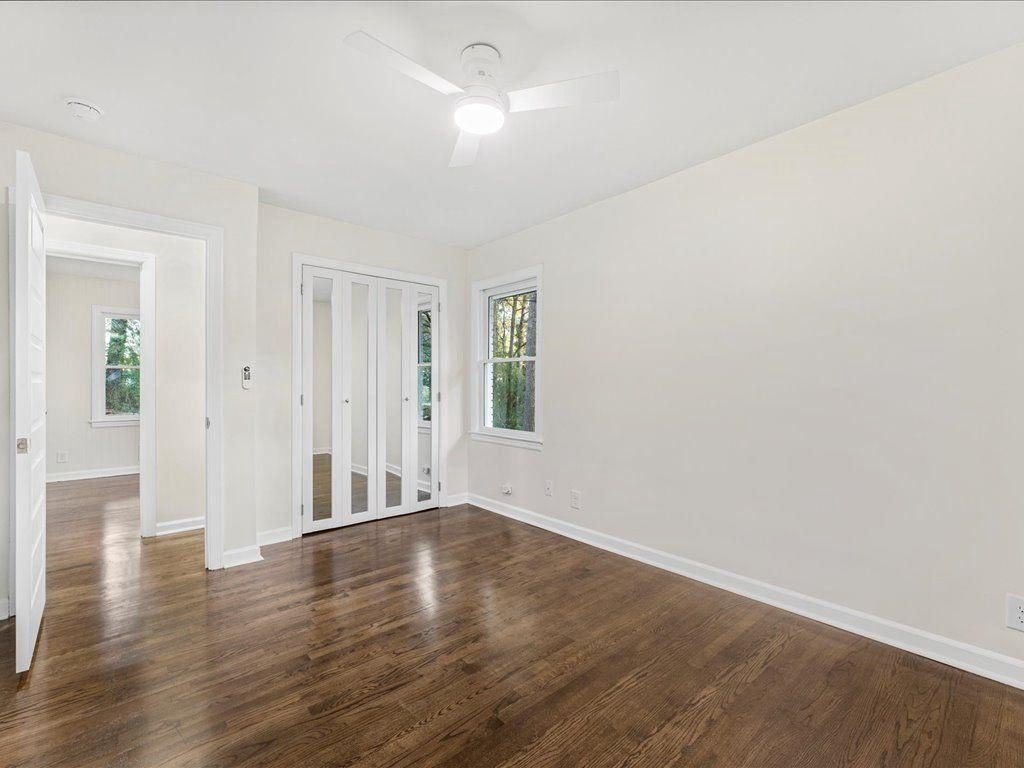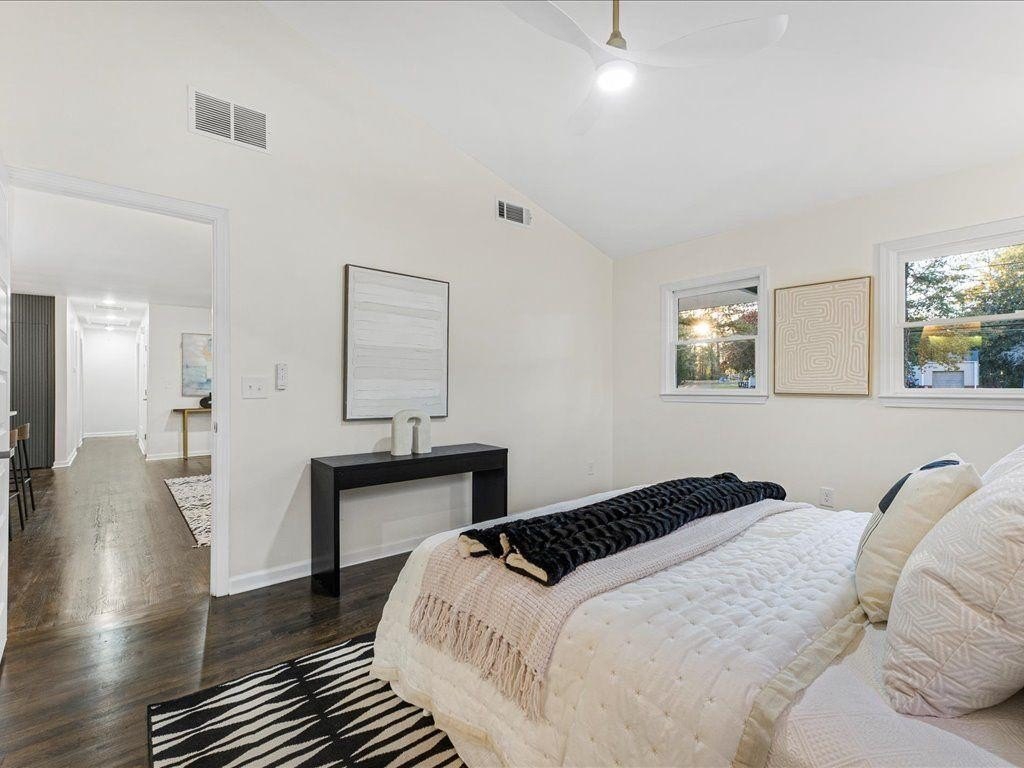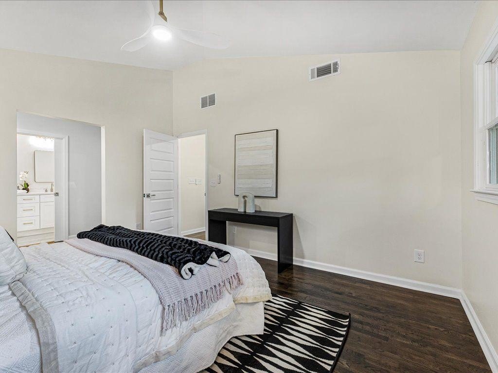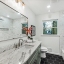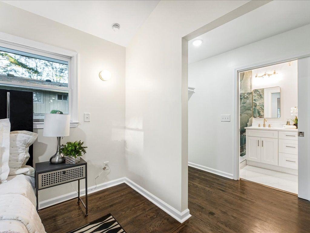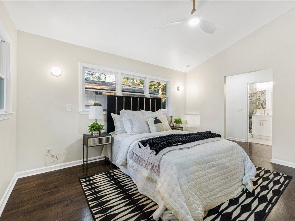 The redesigned kitchen includes quartz countertops, a marble backsplash, stainless steel appliances, and a walk-in pantry closet, providing excellent storage and style. Bathrooms have been fully renovated with modern tile and fixtures.