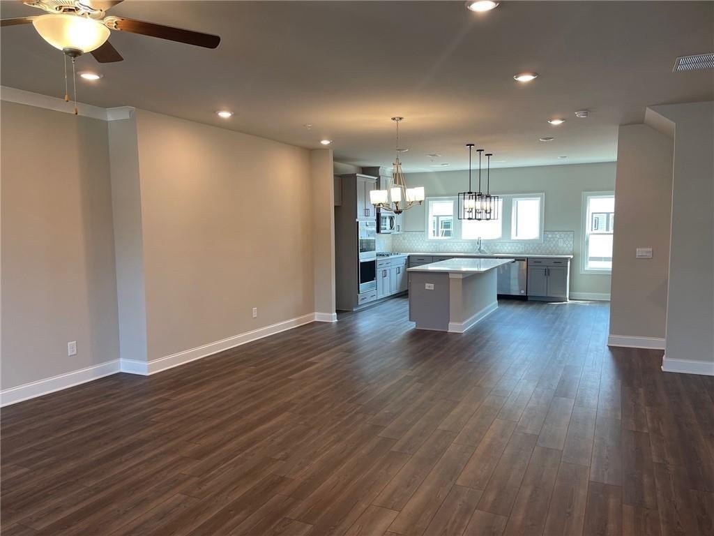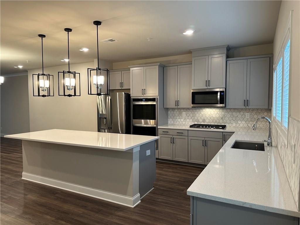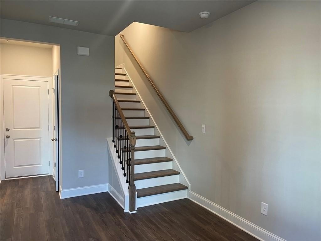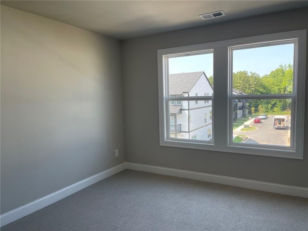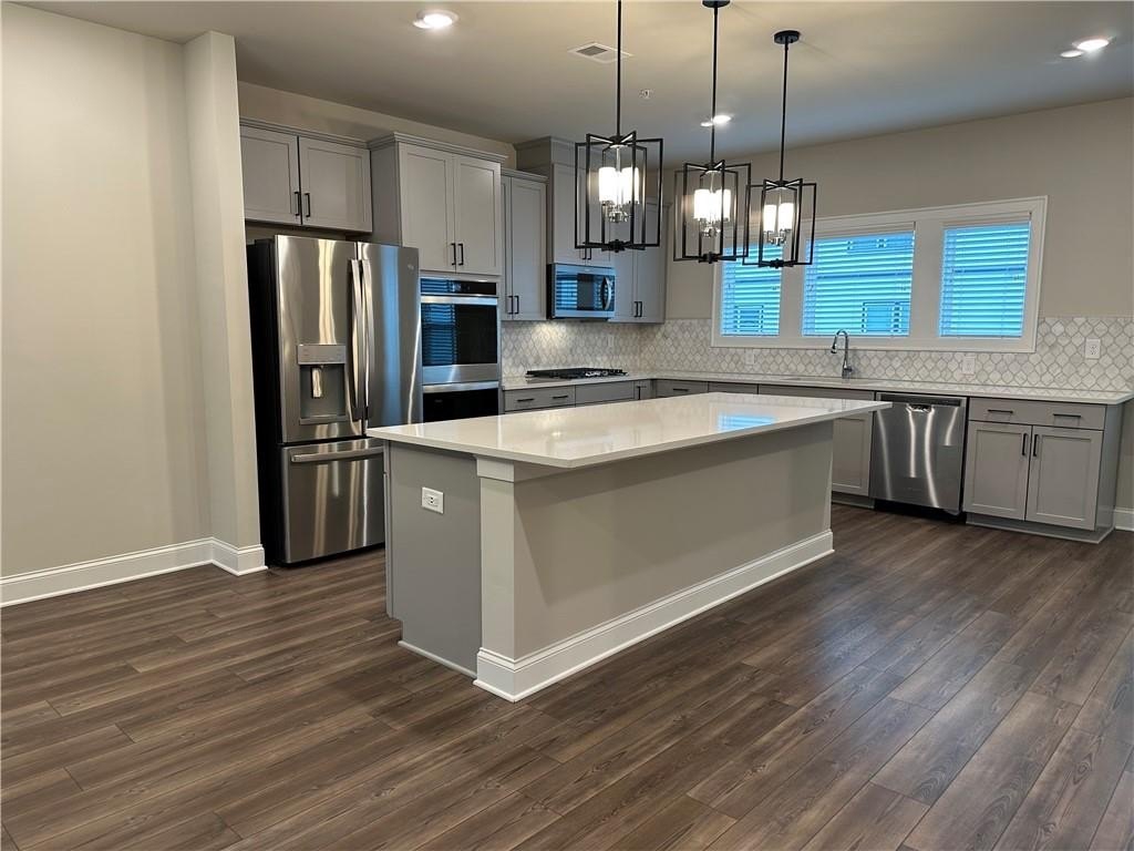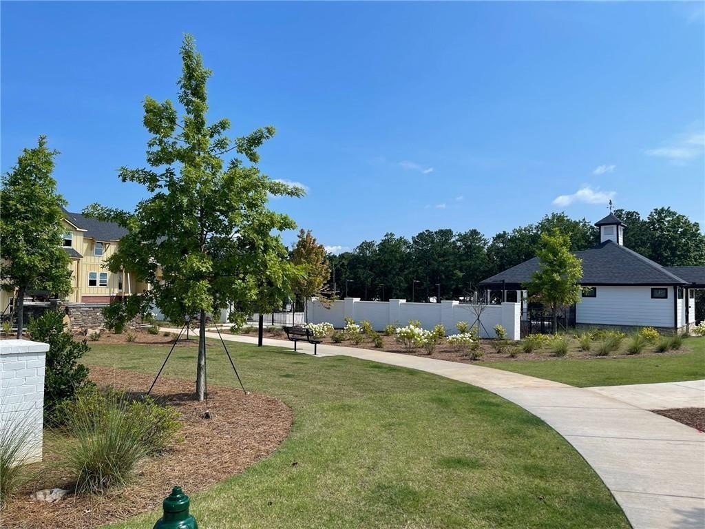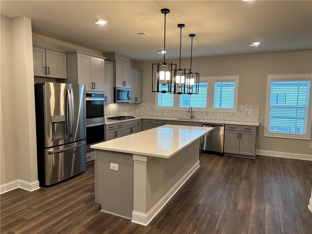 This townhome is located in Ridgewalk Landing and is the Leighton floorplan. On the first level you will find the two car garage, bedroom, full bath and entry foyer. The second level features a beautiful kitchen with double ovens, a gas cooktop, a built-in microwave, a refrigerator, dishwasher, and disposal. There is a large island with a breakfast bar and a large, walk-in pantry. This level also has the great room, the dining room, a breakfast room, a coat closet and a half-bath. Upstairs you will find the primary suite with a large walk-in shower, a double vanity, a toilet closet, and a large walk-in closet. Also on the upper level you will find two additional bedrooms, a full bath, and the laundry room complete with washer and dryer. This townhome is within walking distance to Costco, Woodstock City Church, an urgent care center, and many other retail shops.