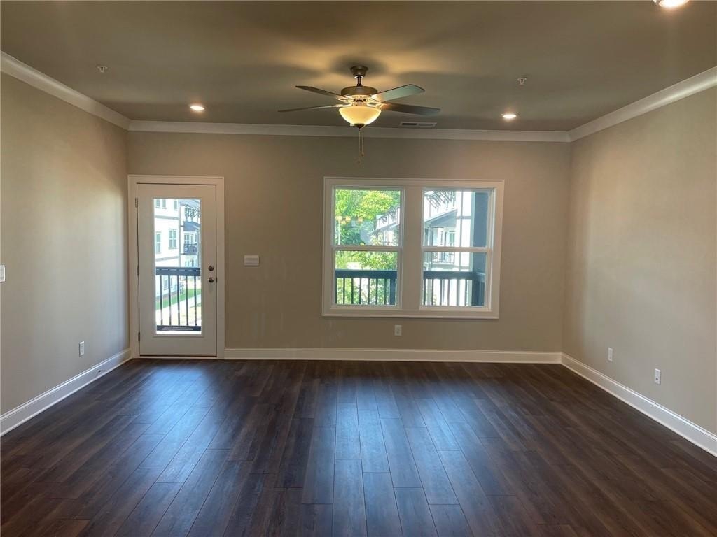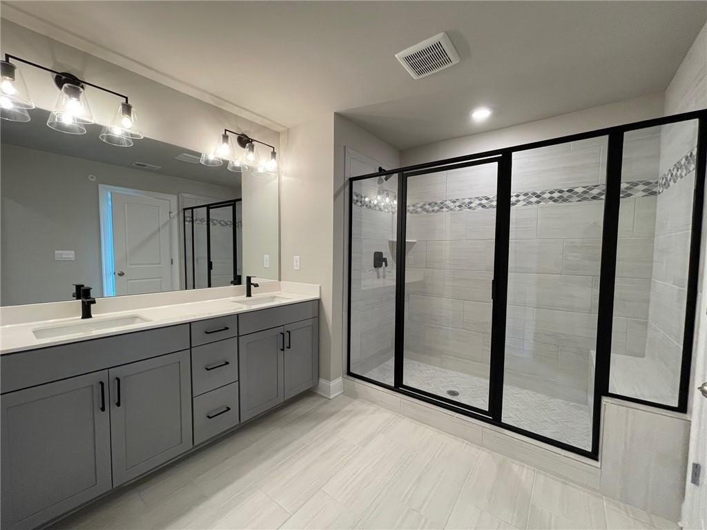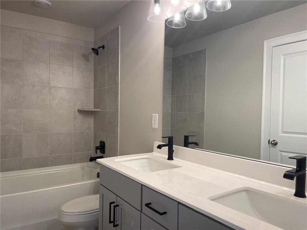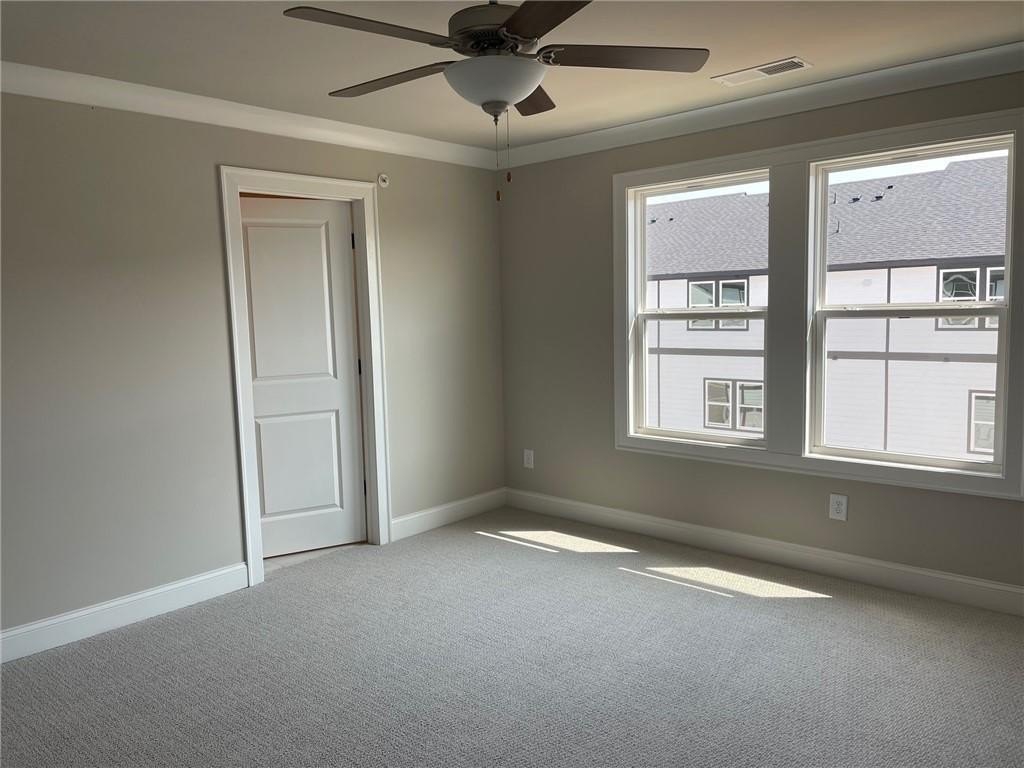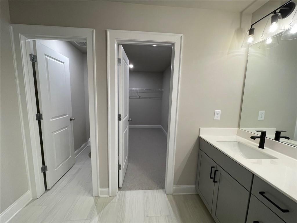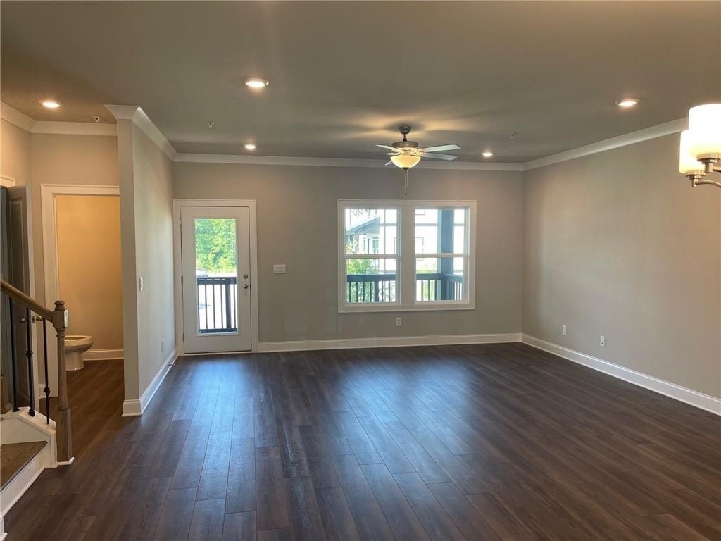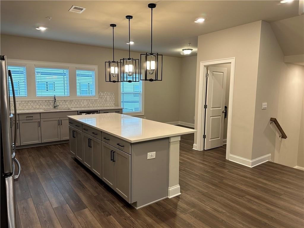 This townhome is located in Ridgewalk Landing and is the Leighton floorplan. On the first level you will find the two car garage, bedroom, full bath and entry foyer. The second level features a beautiful kitchen with double ovens, a gas cooktop, a built-in microwave, a refrigerator, dishwasher, and disposal. There is a large island with a breakfast bar and a large, walk-in pantry. This level also has the great room, the dining room, a breakfast room, a coat closet and a half-bath. Upstairs you will find the primary suite with a large walk-in shower, a double vanity, a toilet closet, and a large walk-in closet. Also on the upper level you will find two additional bedrooms, a full bath, and the laundry room complete with washer and dryer. This townhome is within walking distance to Costco, Woodstock City Church, an urgent care center, and many other retail shops.