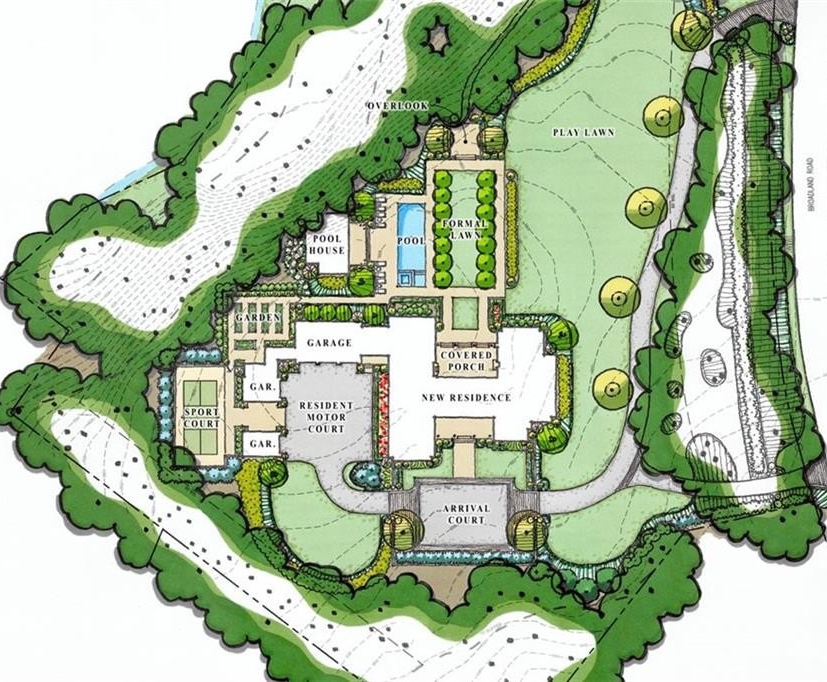 The plan centers on a sprawling main residence positioned perfectly on the level hilltop where the current home stands. Extensive mature screening already shields the homesite from Broadland Road, ensuring complete privacy. A double drive loops gracefully to the front entrance and continues through to a 5-bay garage and family motor court.