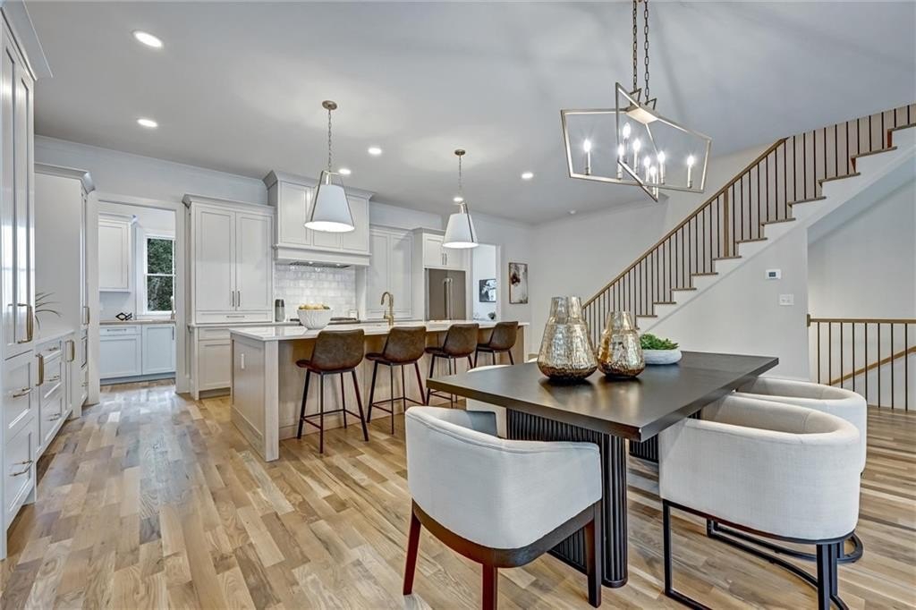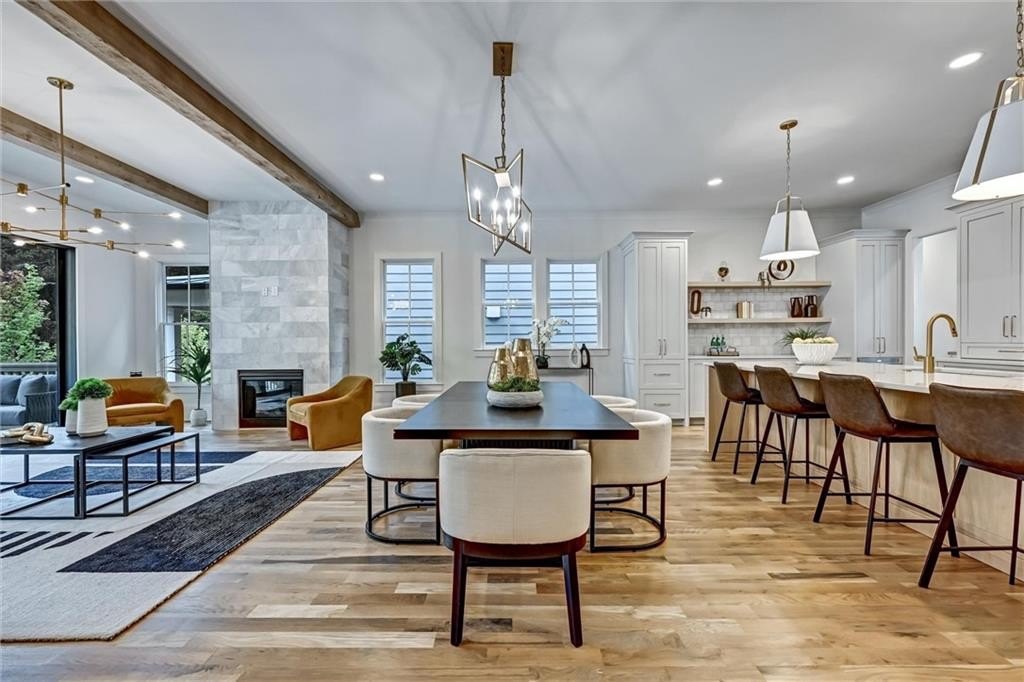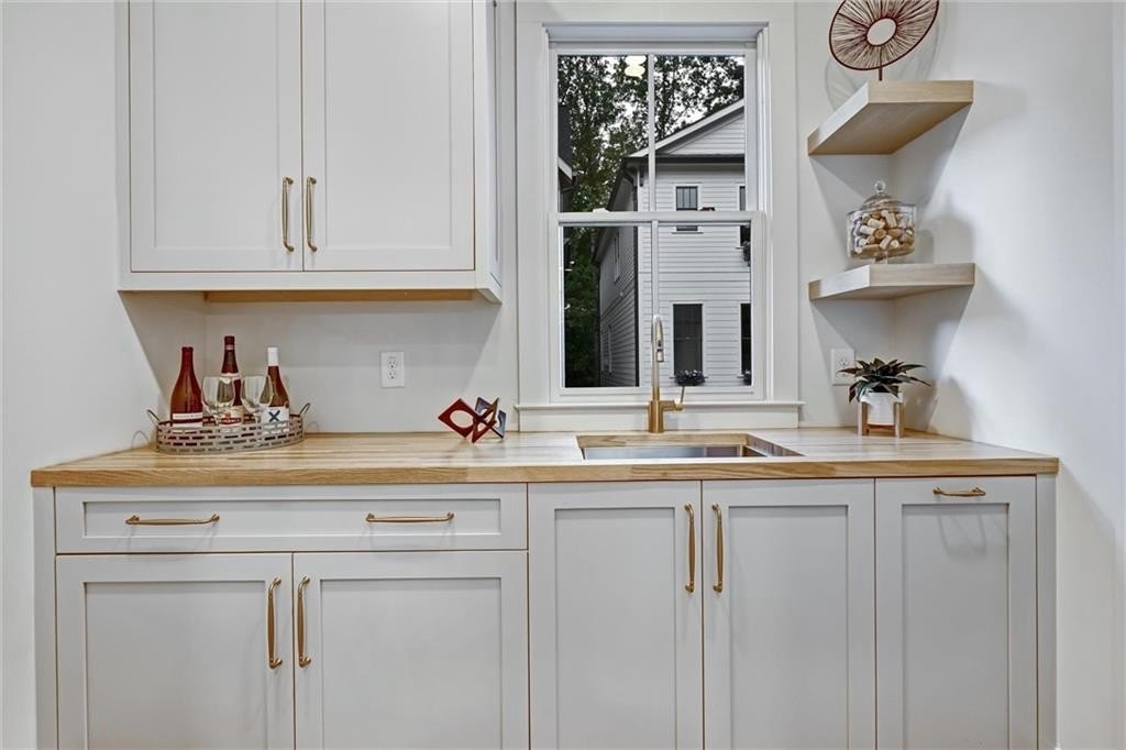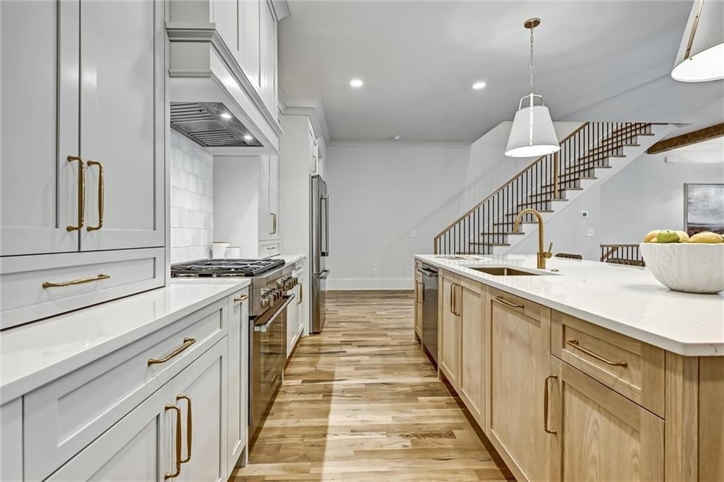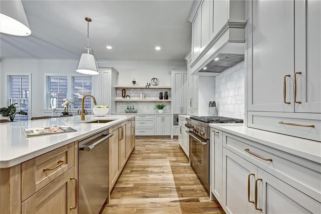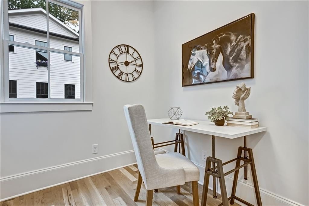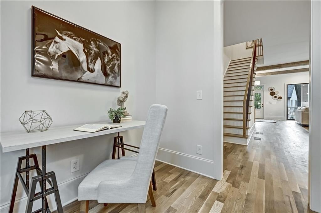 My kitchen is where life gathers—custom cabinetry steady and quiet, a Thermador range ready for feast-making, a vent hood with strength hidden behind beauty and a pantry large enough to keep the rhythm of daily life humming. Nearby, a built-in wet bar waits for laughter, for shared bottles, for evenings that run long and spill onto the porch. I hold space for work too: an office nook tucked just out of the way.