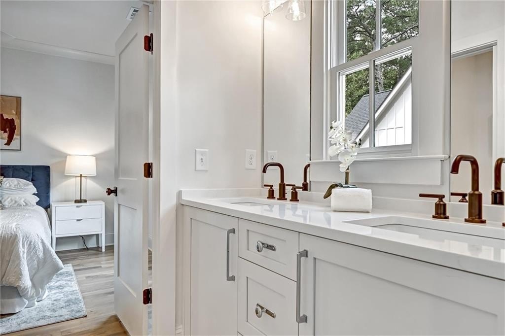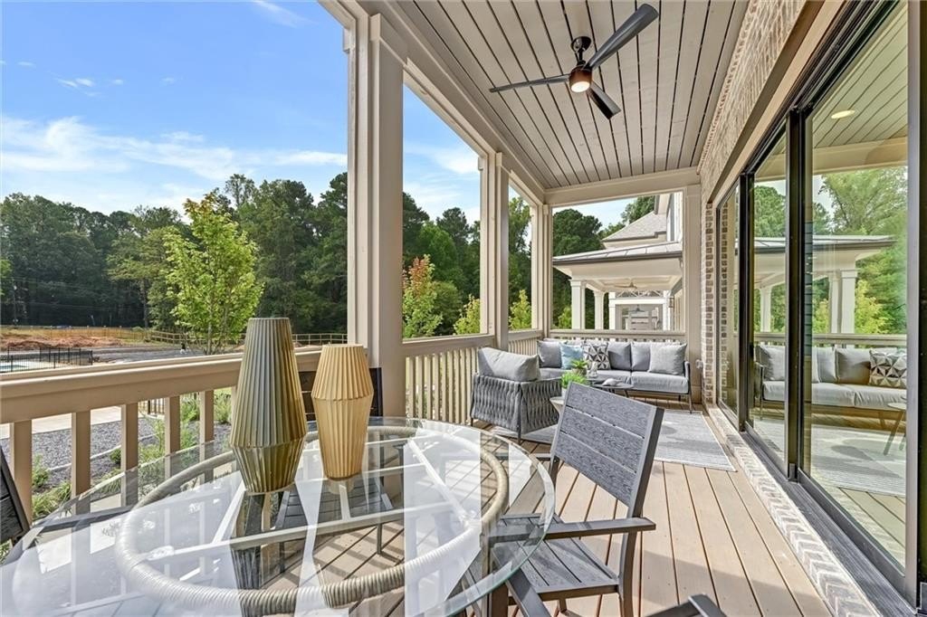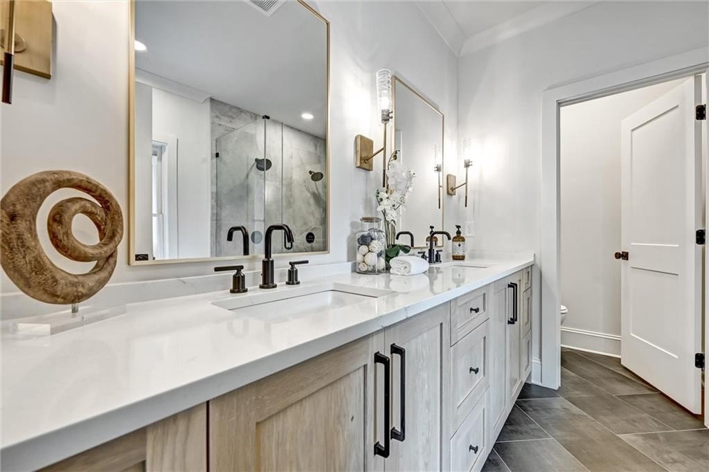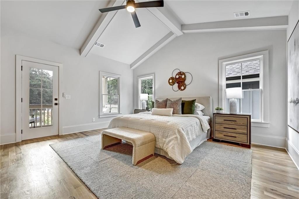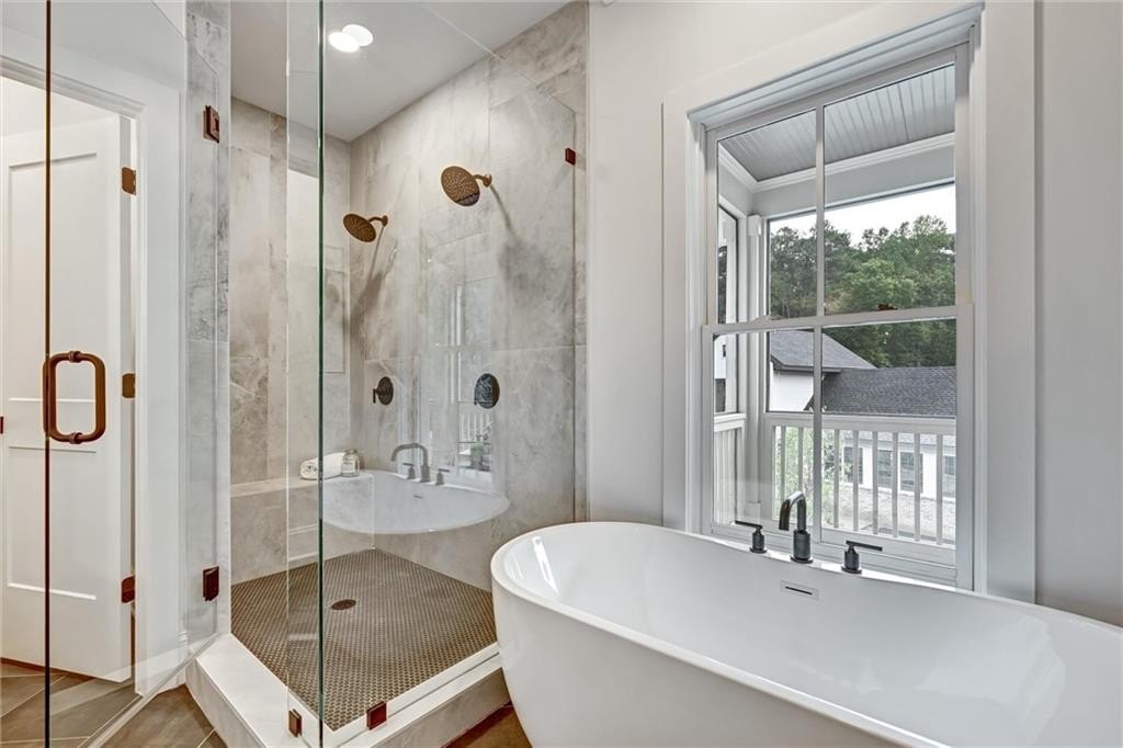 Upstairs, I shelter rest. My primary suite is a sanctuary, vaulted ceiling stretching skyward. The screened balcony holds morning coffee and slow conversations. In the bath, the double-headed shower washes away the weight of the day, and the deep tub invites stillness.