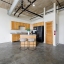 A dramatic open layout with curved architectural walls creates flexible living, dining, and studio spaces. The kitchen features warm wood cabinetry, a central island, and black appliances.