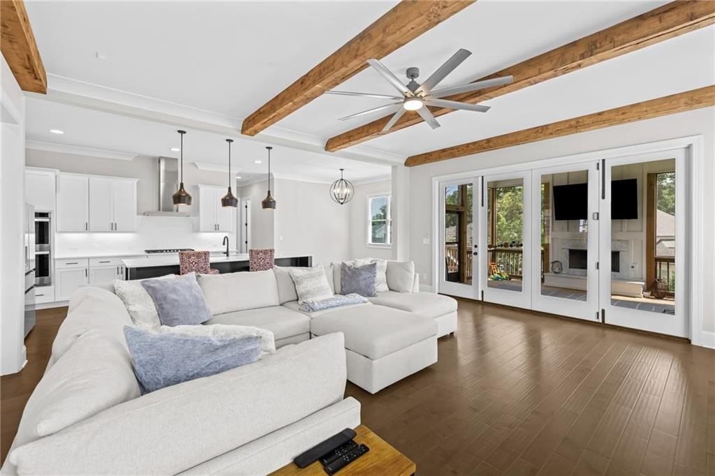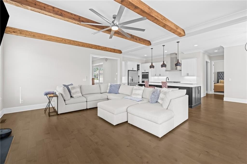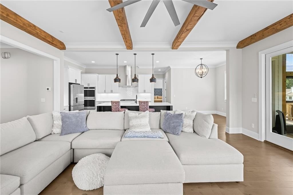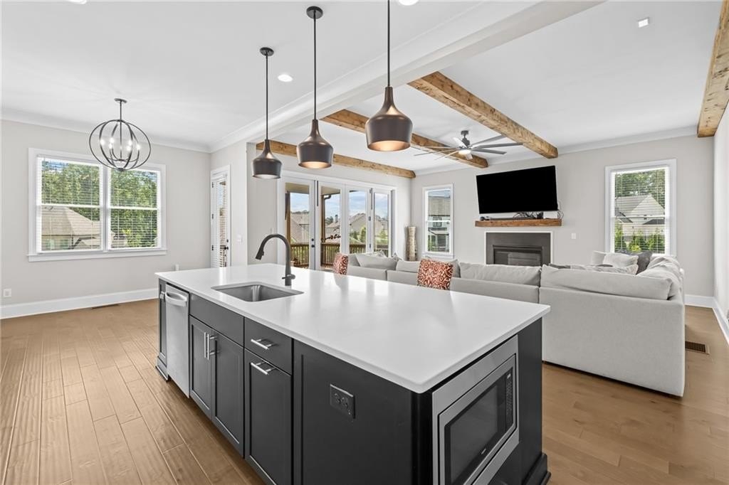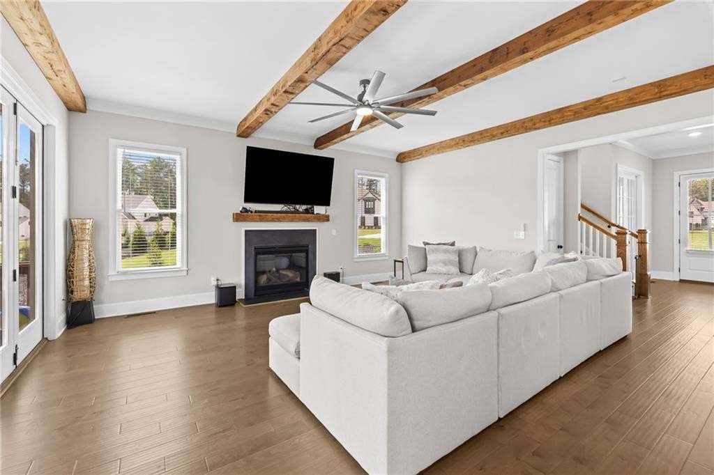 A beautifully appointed guest suite with its own full bathroom sits on the main level, perfect for in-laws, visitors, or multigenerational living. The heart of the home is the expansive family room, complete with striking exposed beams, a cozy fireplace, and an open-concept design that flows seamlessly into the eat-in kitchen.