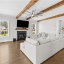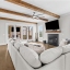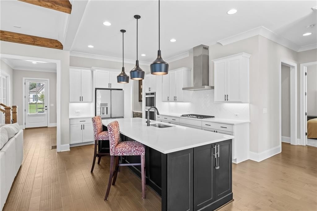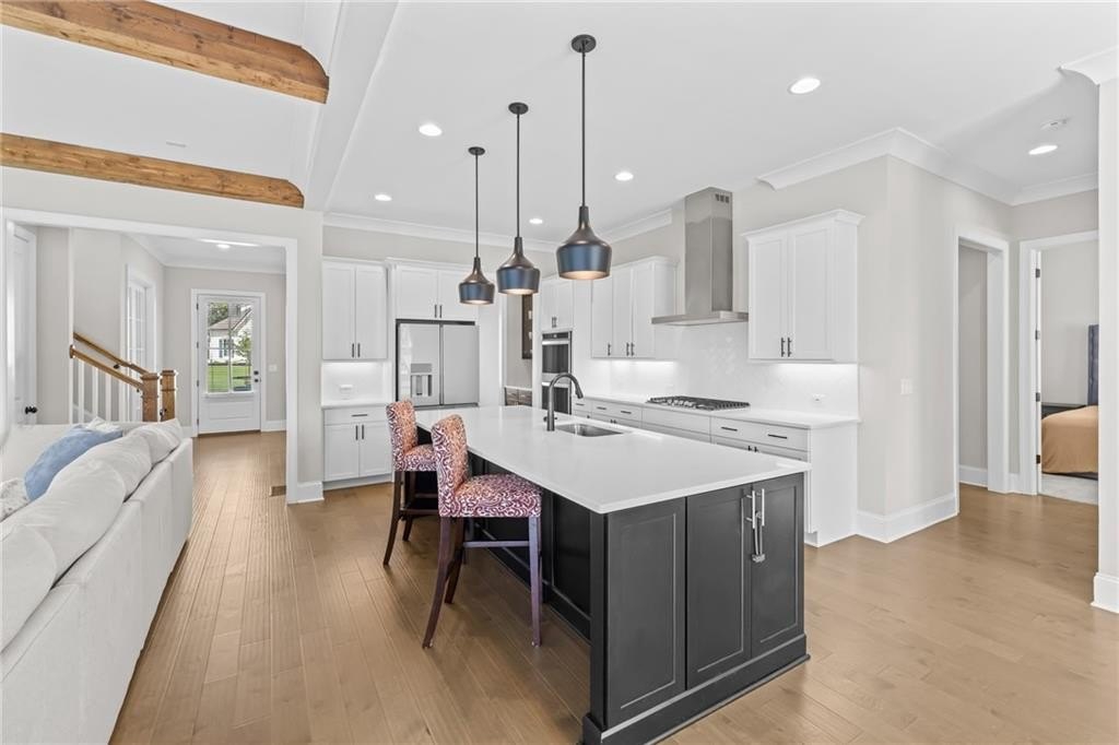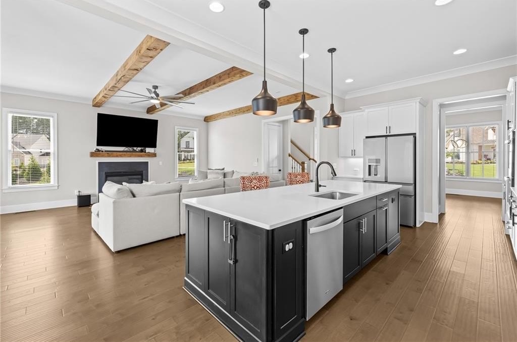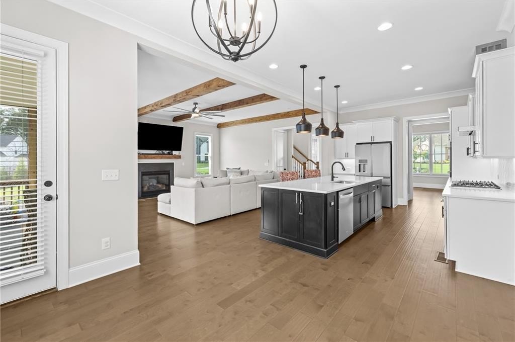 A beautifully appointed guest suite with its own full bathroom sits on the main level, perfect for in-laws, visitors, or multigenerational living. The heart of the home is the expansive family room, complete with striking exposed beams, a cozy fireplace, and an open-concept design that flows seamlessly into the eat-in kitchen.