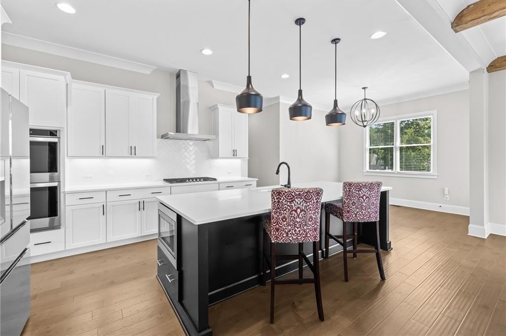 The kitchen is a true centerpiece, featuring premium cabinetry, a large center island, stainless steel appliances, quartz countertops, and a generous walk-in pantry. Whether you’re preparing family meals, hosting friends, or enjoying quiet mornings, this kitchen offers both beauty and function. Just off the kitchen, the covered rear deck serves as an incredible outdoor retreat. With its own fireplace and an additional grilling deck, this space is truly made for year-round relaxation and entertainment.