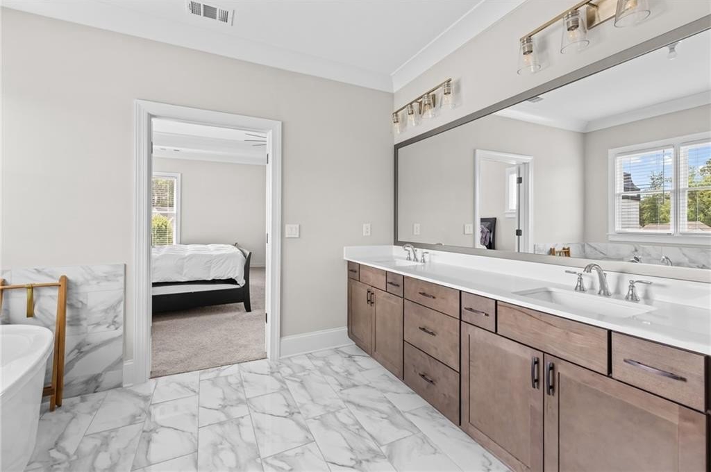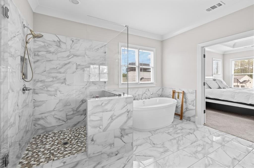 Upstairs, you’ll find a spacious loft that can easily serve as a secondary living room, playroom, gym, or media area. The oversized primary suite is a luxurious escape, offering a spa-like bathroom with dual vanities, a soaking tub, a glass-enclosed shower, and an enormous walk-in closet that feels like its own private dressing room.