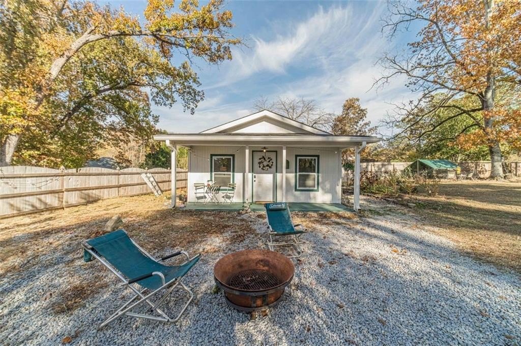 Between the carriage house and the main home is a large open area—an inviting, flexible space perfect for gatherings, fire pits, or simply enjoying the glow of the string lights in the evenings.