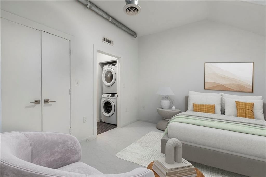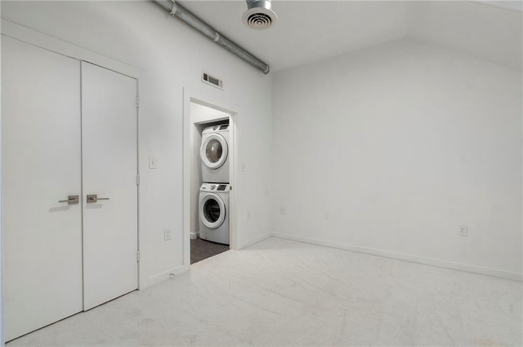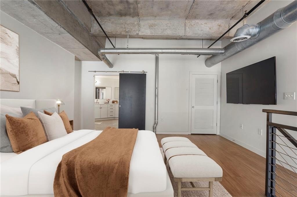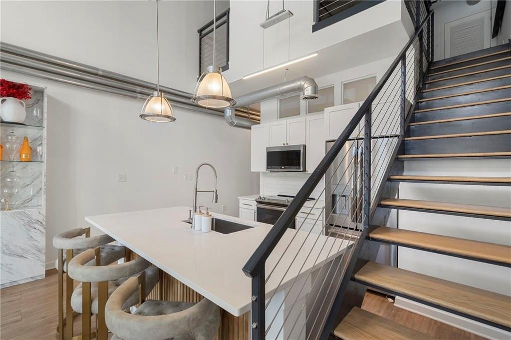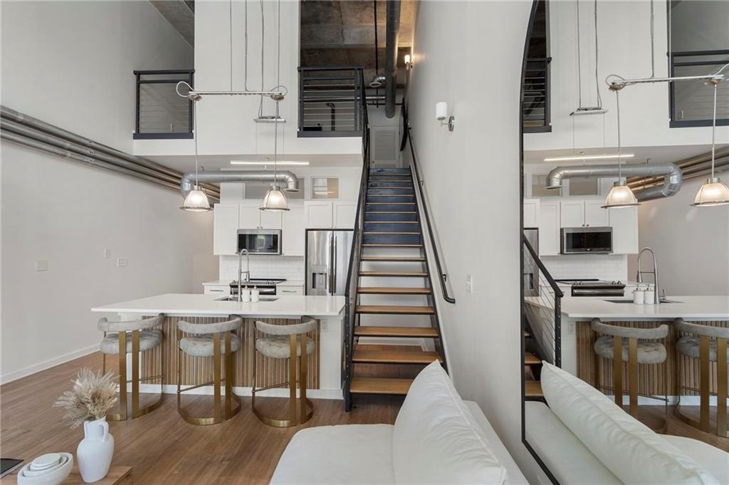 Experience the ultimate in urban living at District Lofts, located in the heart of Atlantic Station—Atlanta’s premier destination for shopping, dining, and entertainment. This stunning 2-bedroom, 2-bath loft condominium features 22-foot ceilings, floor-to-ceiling windows, and exposed beams, creating a dramatic and light-filled living space. The main level showcases an open-concept layout with a custom fireplace and entertainment center, designer finishes, and thoughtful built-ins that maximize both style and functionality. The chef’s kitchen offers soft-close wood cabinetry, quartz countertops, stainless-steel appliances, and a large island perfect for entertaining. Upstairs, the spacious owner’s suite includes an updated bath with an oversized shower, frameless glass enclosure, and a fashionista-inspired walk-in closet hidden behind a mirrored sliding door. The guest bedroom features new carpet and ample storage. This home features a large walk in storage unit on the same floor as the home, and 2 parking spaces. Enjoy your private balcony/deck, ideal for morning coffee or evening relaxation. Building amenities feature a modern lobby with a sitting area and glass-enclosed conference room. Perfectly situated just steps from Target, Publix, IKEA, restaurants, boutiques, and entertainment options including the movie theater, bowling alley, and seasonal events on the Green. Convenient to Georgia Tech (1.3 mi), Georgia State University, Microsoft’s Atlanta campus, I-75/I-85, and only 11.6 miles from Hartsfield-Jackson Airport—with nearby shuttle service for added ease. 2 deeded garage parking space is included in this pet-friendly, non-smoking community. Discover the perfect combination of modern luxury, convenience, and walkable city living at District Lofts.