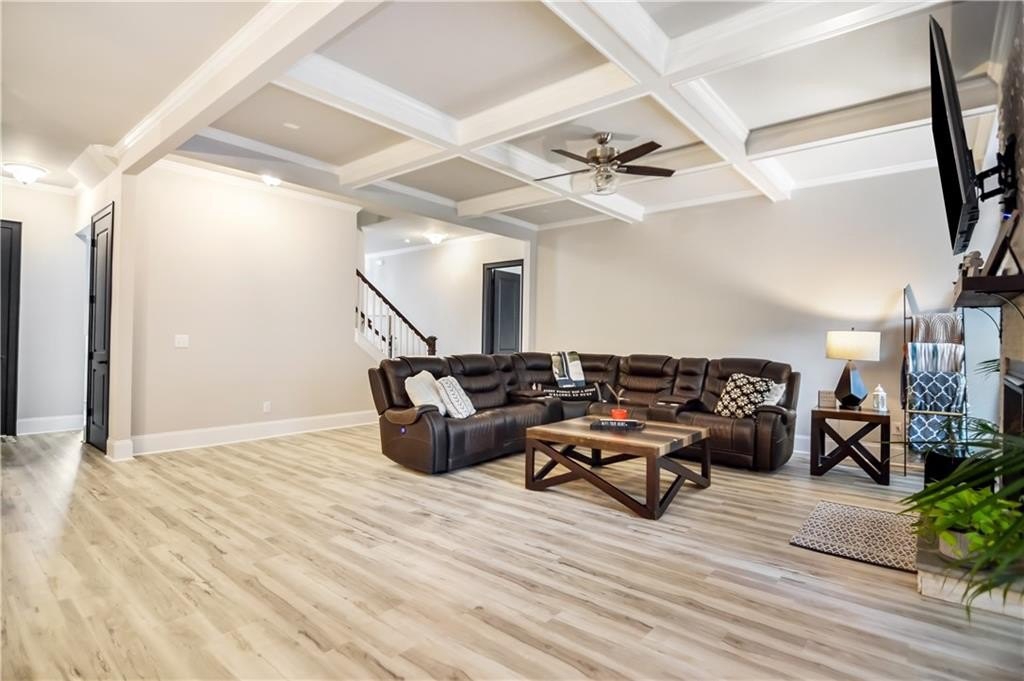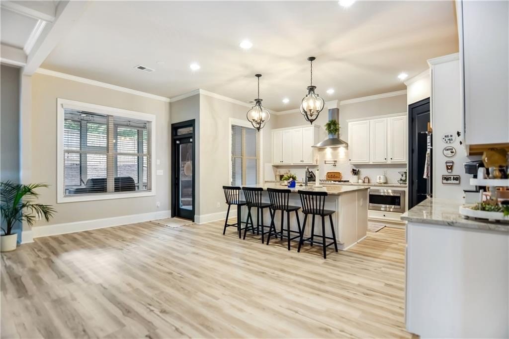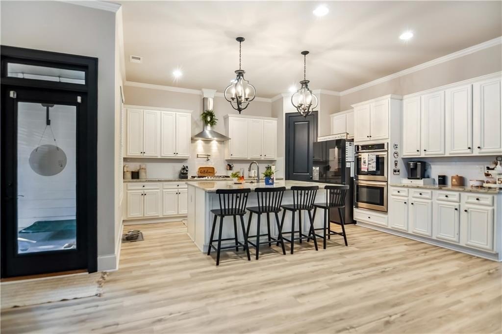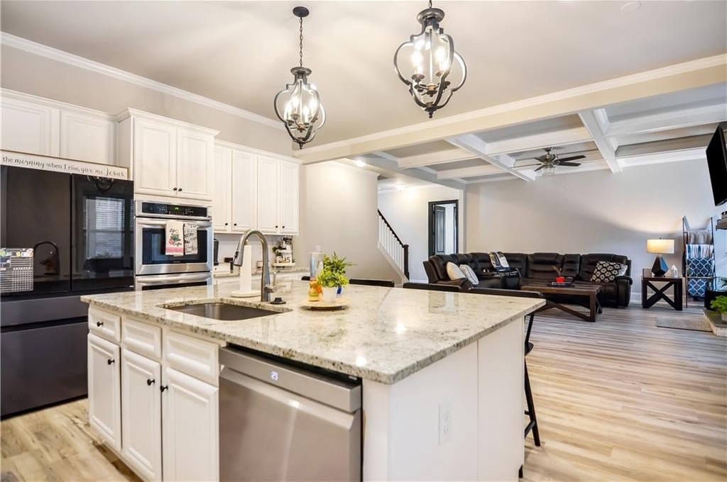 Freshly painted on the main level, this move-in ready home greets you with an inviting open floor plan, 10-foot ceilings, and refined coffered and tray ceiling details. The gourmet kitchen is a chef’s dream—featuring white cabinetry, a massive island with pot filler, double ovens, and stunning stone countertops—perfect for cooking and entertaining alike. The adjoining family room offers a cozy gas log fireplace and expansive windows overlooking the private, wooded backyard.