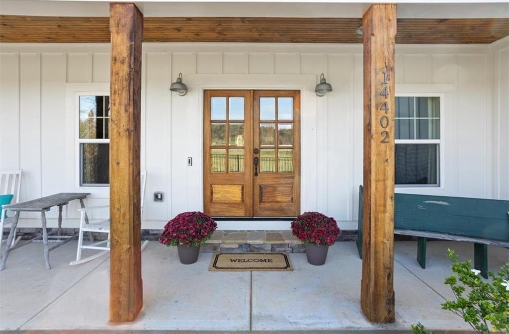 Charming Modern Farmhouse on 4.82 Private Acres! Welcome home to this stunning farmhouse retreat perfectly situated on a partially wooded 4.82-acre lot, offering the ideal blend of privacy and modern comfort. From the inviting front porch to the spacious open-concept interior, this home is designed for both relaxation and entertaining. The front yard is beautifully cleared and grassy, providing a perfect space for outdoor play or gatherings, while the backyard offers a peaceful wooded backdrop for added privacy. Enjoy morning coffee or evening sunsets from the back deck. Enjoy your own fenced garden area with raised beds and a charming picket fence—perfect for growing flowers, herbs, or vegetables. Step inside to a light-filled great room featuring cathedral ceilings and a seamless flow into the dining area and chef’s kitchen. The kitchen boasts custom crisp, white cabinetry, gleaming granite countertops, and high-end GE Café appliances, making it the heart of the home. A separate office or optional formal dining room offers flexible space to fit your lifestyle. The luxurious master suite is a true retreat, featuring a huge walk-in closet and a spa-inspired bath with dual vanities, a soaking tub, and a large tiled shower filled with natural light. The split bedroom floor plan provides three spacious secondary bedrooms and a beautifully appointed hall bath with stylish tile flooring and a tiled tub/shower combo. Enjoy the convenience of the dream laundry/mudroom, complete with custom cabinetry, abundant storage, and a sink — perfect for today’s busy household. Additional highlights include a large two-car kitchen-level garage, extra-wide stairs leading to an unfinished basement (stubbed for a bath) offering endless possibilities, and a walk-up attic with permanent stairs, offering tons of storage, and ready to be finished into a bonus room or additional living space. This exceptional property combines modern amenities with timeless farmhouse charm. Don’t miss this rare opportunity to own a piece of country paradise!