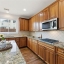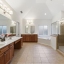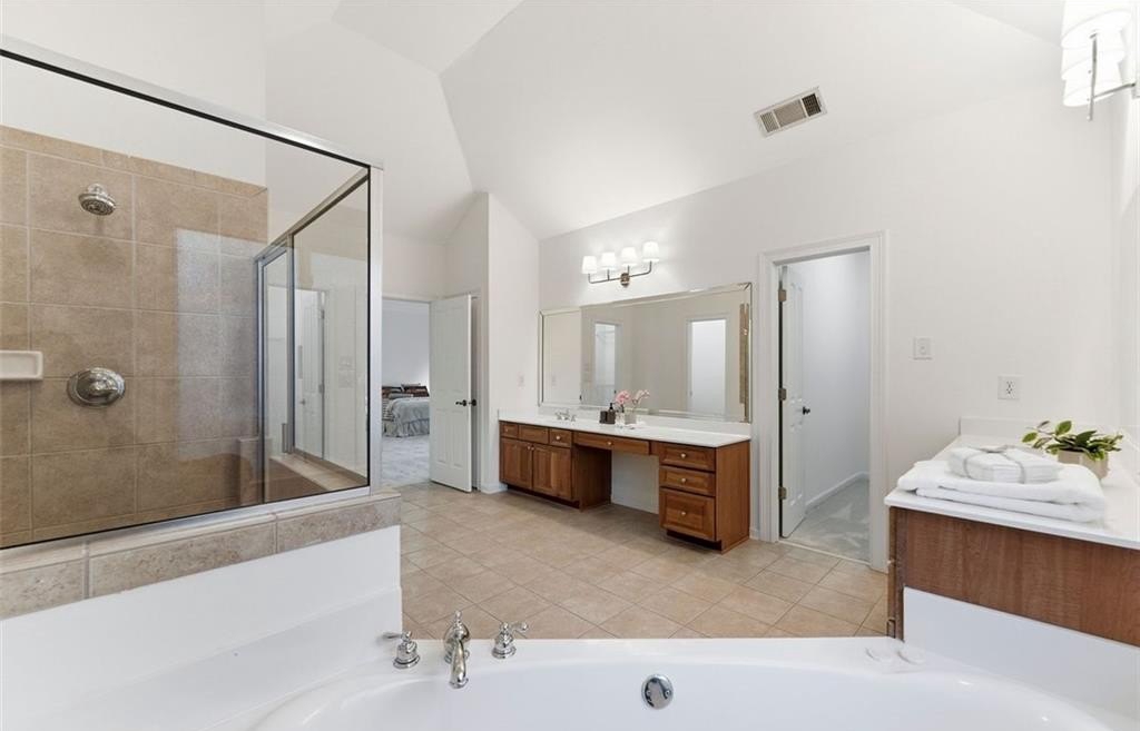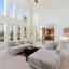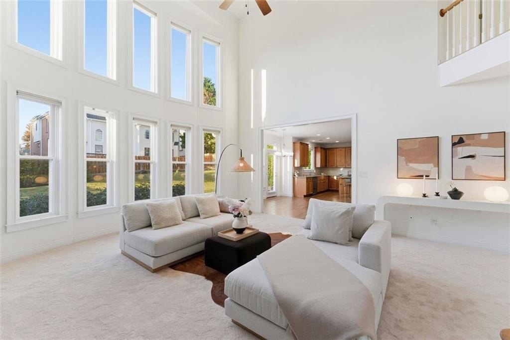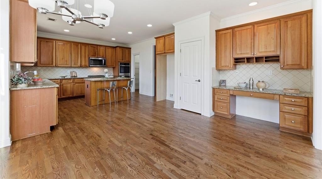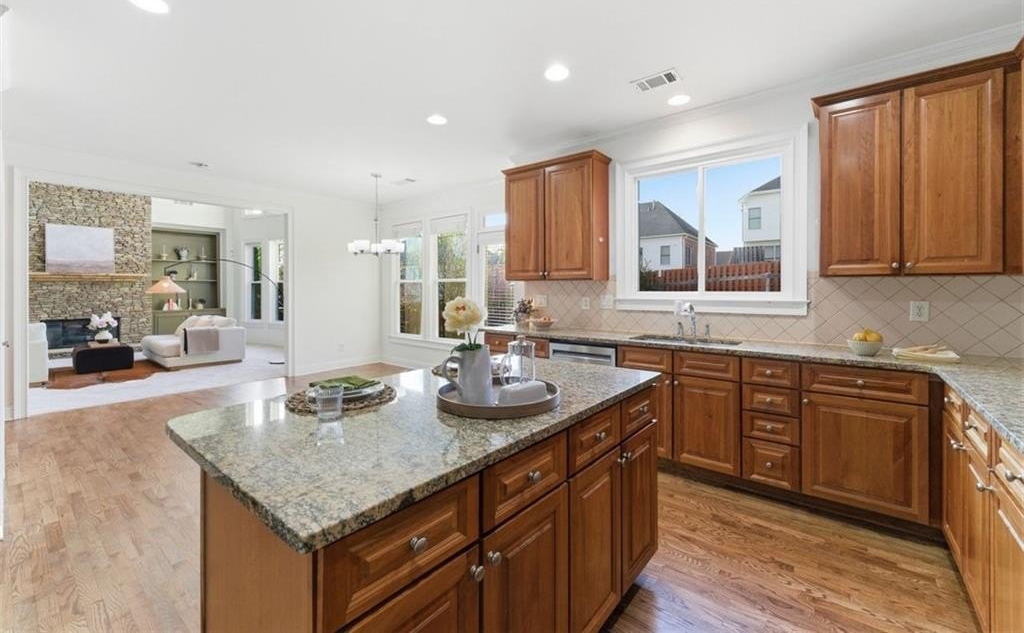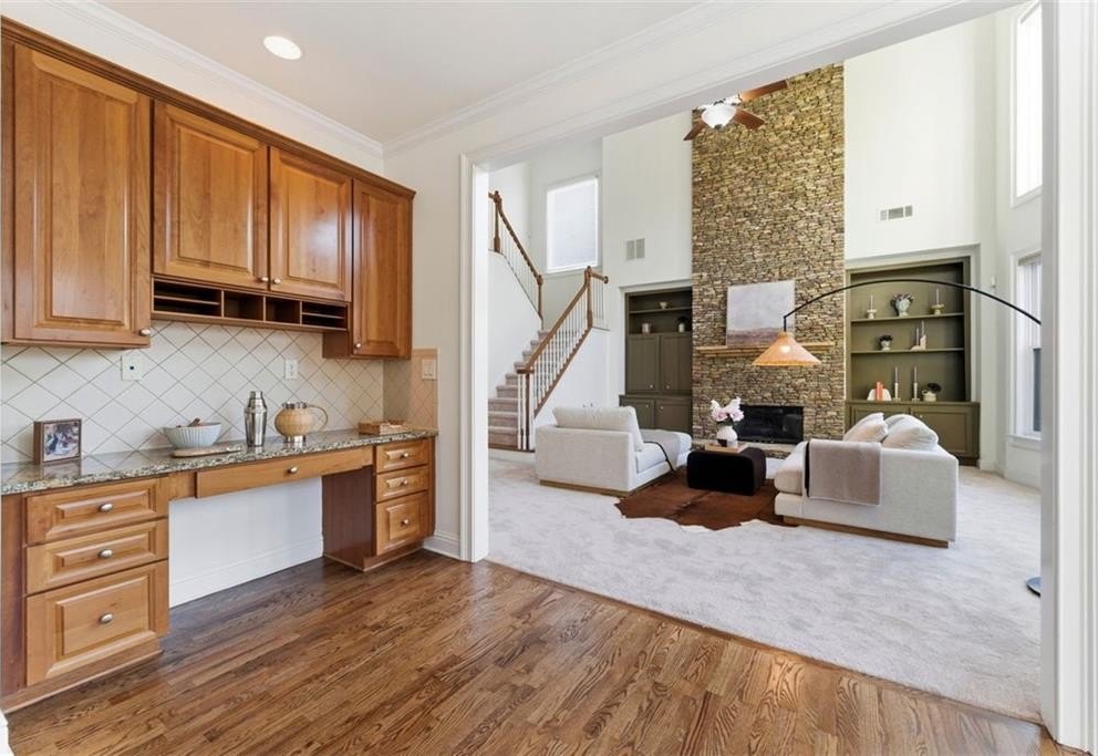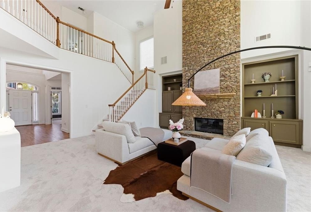 Inside, natural light pours through the soaring windows of the family room, highlighting the stacked-stone fireplace and built-in bookshelves, a space equally inviting for quiet nights or lively gatherings. The chef’s kitchen is a dream with granite countertops, stainless steel appliances, double ovens, a large pantry, kitchen island, writing desk, and butler’s pantry, ideal for anyone who loves to cook or host.
