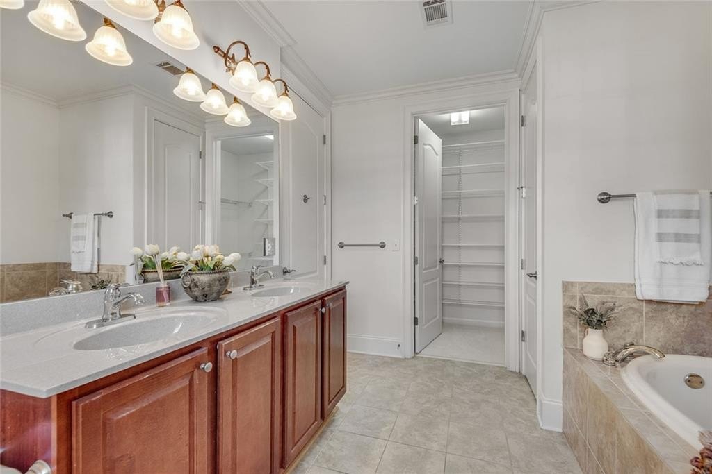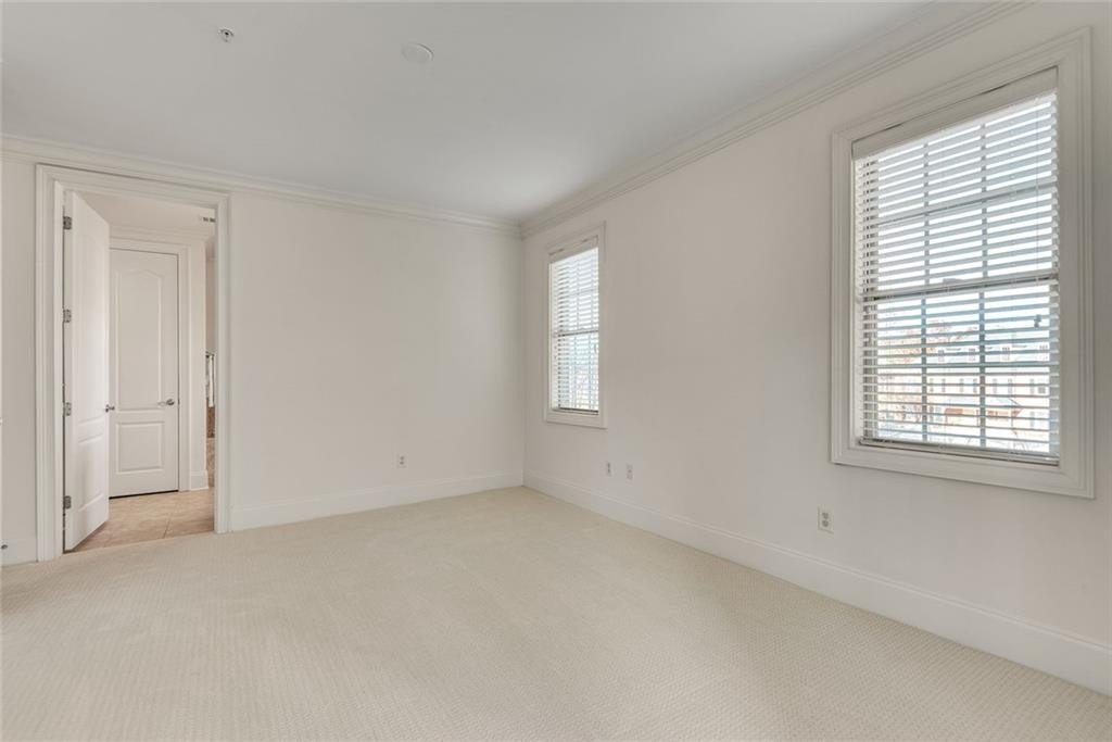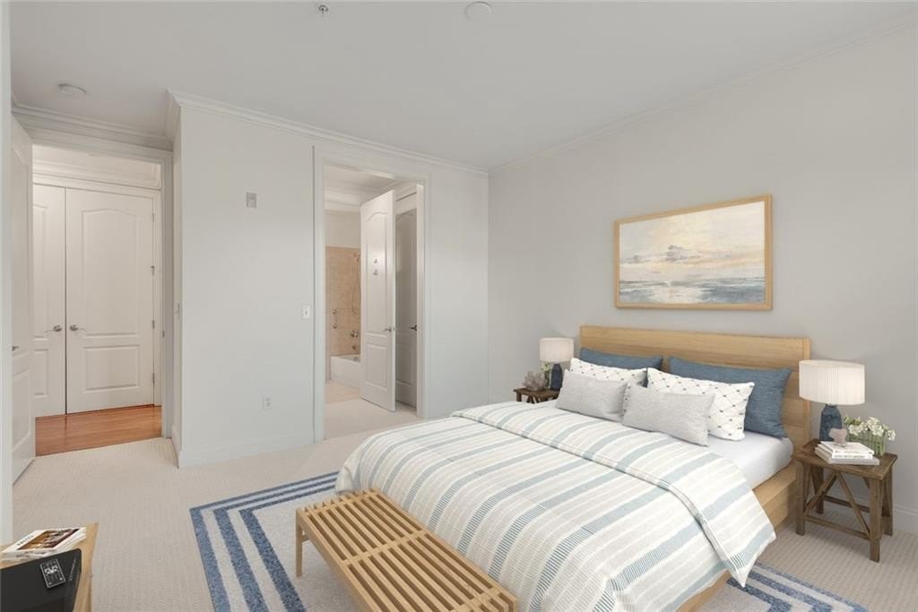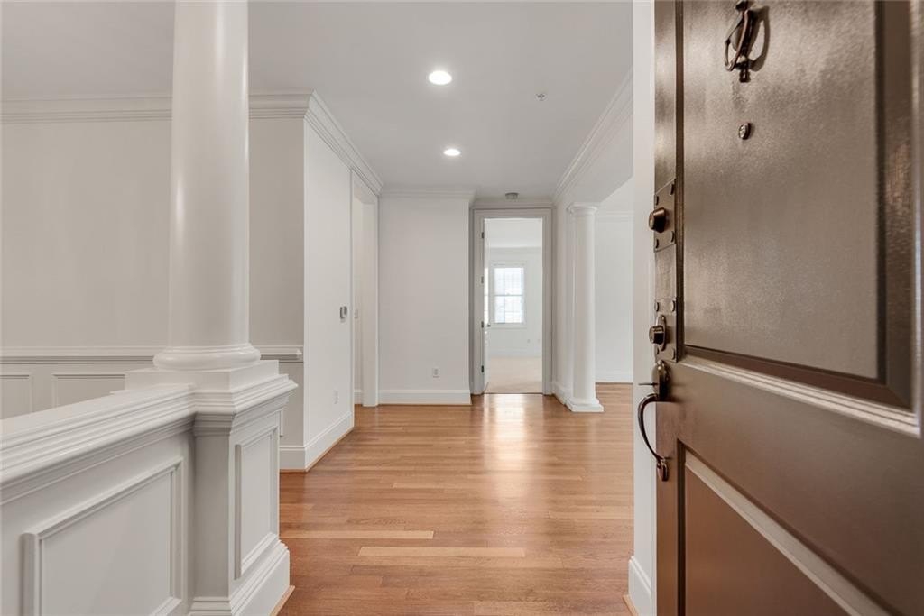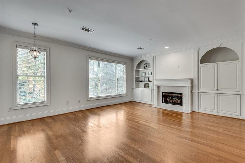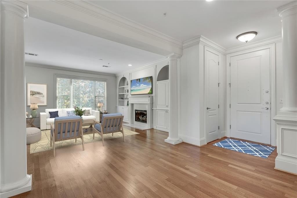 Discover a unique opportunity for one-level, maintenance-free, move-in ready living in this popular, gated community on the quiet side of Dunwoody. This spacious, two-bedroom corner unit is bathed in natural light, featuring a desirable southern exposure and treetop views. Key features include fresh paint throughout, new carpet in the bedrooms, and hardwood floors in the main living areas. Enjoy custom built-ins in the living room, elegant crown molding, and practical Elfa shelving. A generous Primary Suite has French doors opening to a spacious patio. The laundry closet accommodates a full-size, side-by-side washer and dryer - an appreciated feature. For extra storage, there’s dedicated space located on the garage level. Sterling of Dunwoody offers a carefree lifestyle with a full suite of amenities, including a large pool with an outdoor fireplace, a clubhouse, fitness center, community garden, pet walk, grilling stations, and ample guest parking. Enjoy the convenience of being just a short walk to Brook Run Park, where you can take advantage of the seasonal Farmer's Market, concerts, food truck nights, walking trails, and recreational activities. The location offers easy access to the MJCCA, Dunwoody Village, Perimeter Mall, Trader Joe's at The Forum, local schools, and amazing restaurants. Commuting is simplified with proximity to I-285, I-85, and GA-400. Enjoy a combination of comfort and convenience that is hard to match.