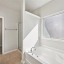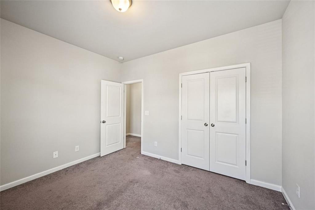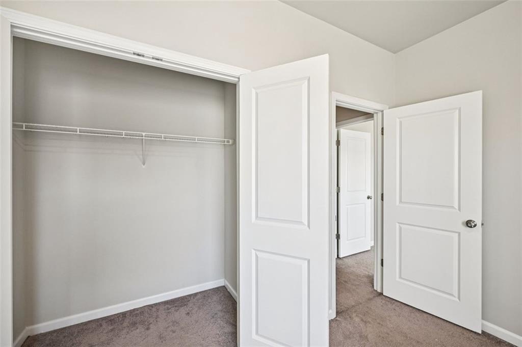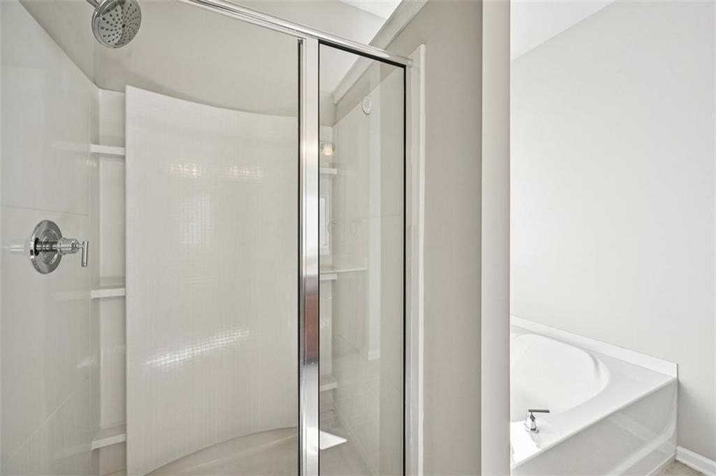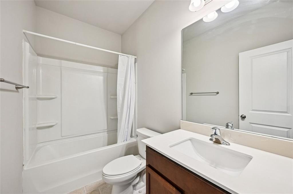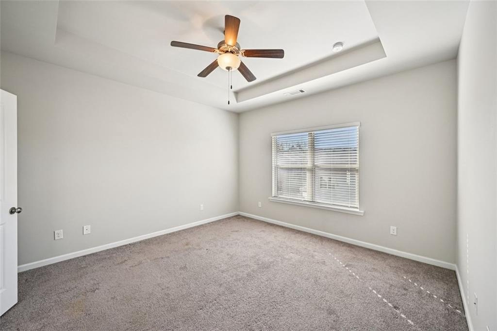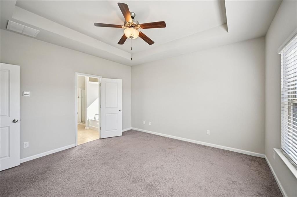 Upstairs, the oversized primary suite features a tray ceiling, walk-in closet, and a private en-suite bathroom with a soaking tub, separate glass-enclosed shower, and double-sink vanity. Three secondary bedrooms provide plenty of flexibility for guest rooms, a home office, or multi-use spaces. The upstairs laundry closet is conveniently located near all bedrooms.
