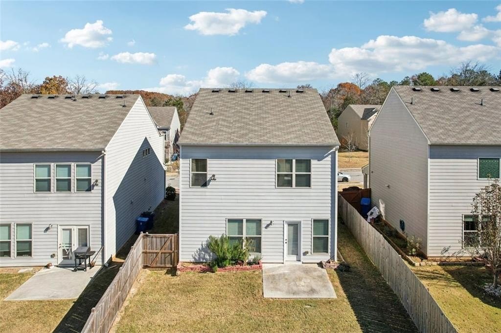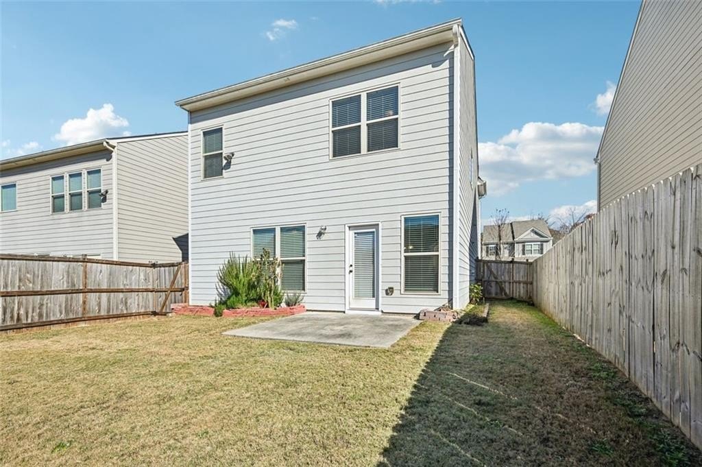 The backyard is fully fenced and includes a concrete patio and level lawn perfect for grilling, outdoor seating, or play.