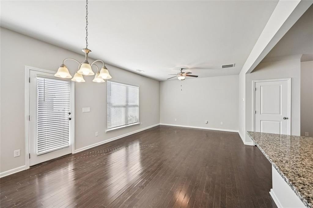 The main level features hardwood flooring in the foyer, dining, and living areas. The kitchen overlooks the family room and includes granite countertops, a large island with seating, stainless steel appliances, stained cabinetry, and a pantry for additional storage. The dining area flows seamlessly into the family room, creating an ideal setup for entertaining and everyday living. A main-level powder room adds convenience for guests.
