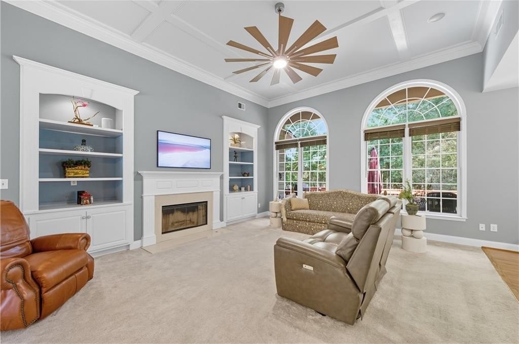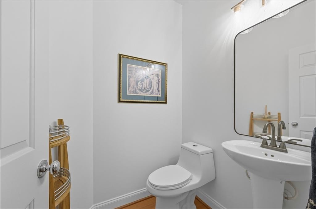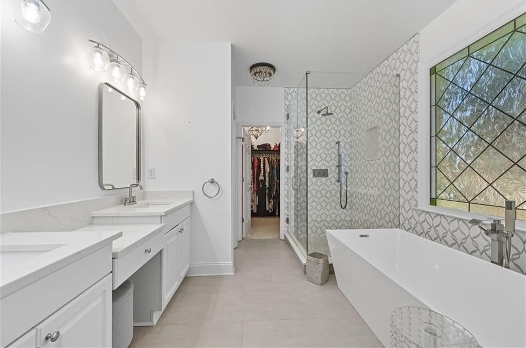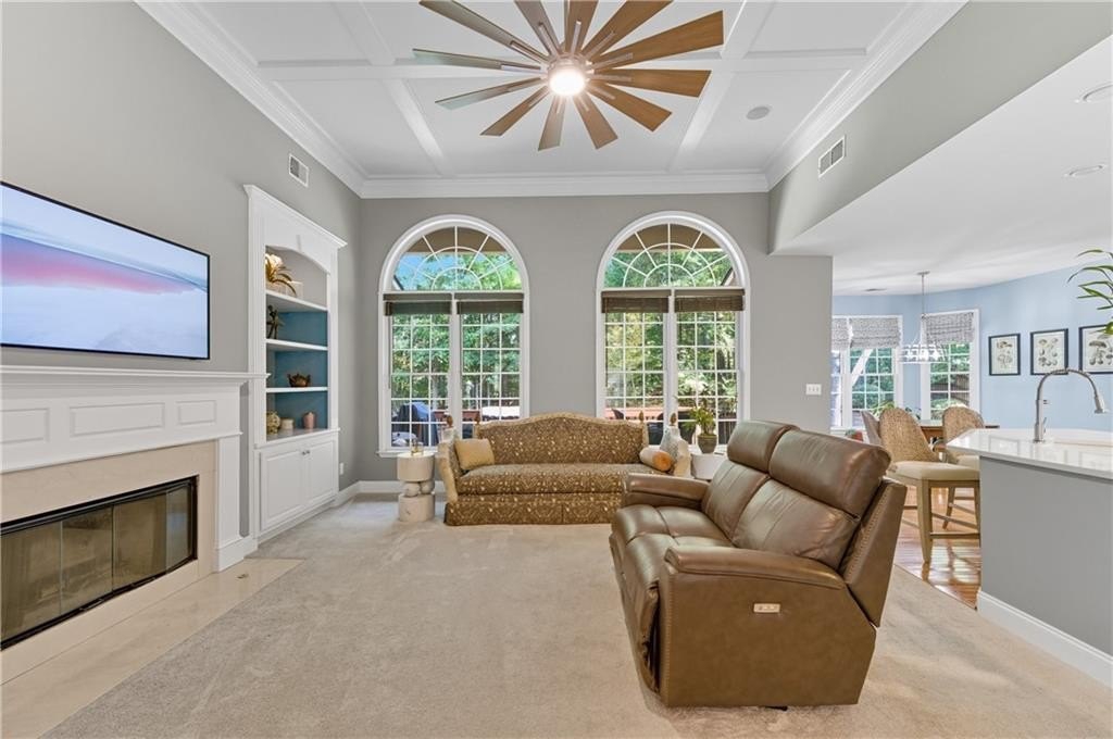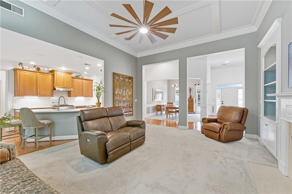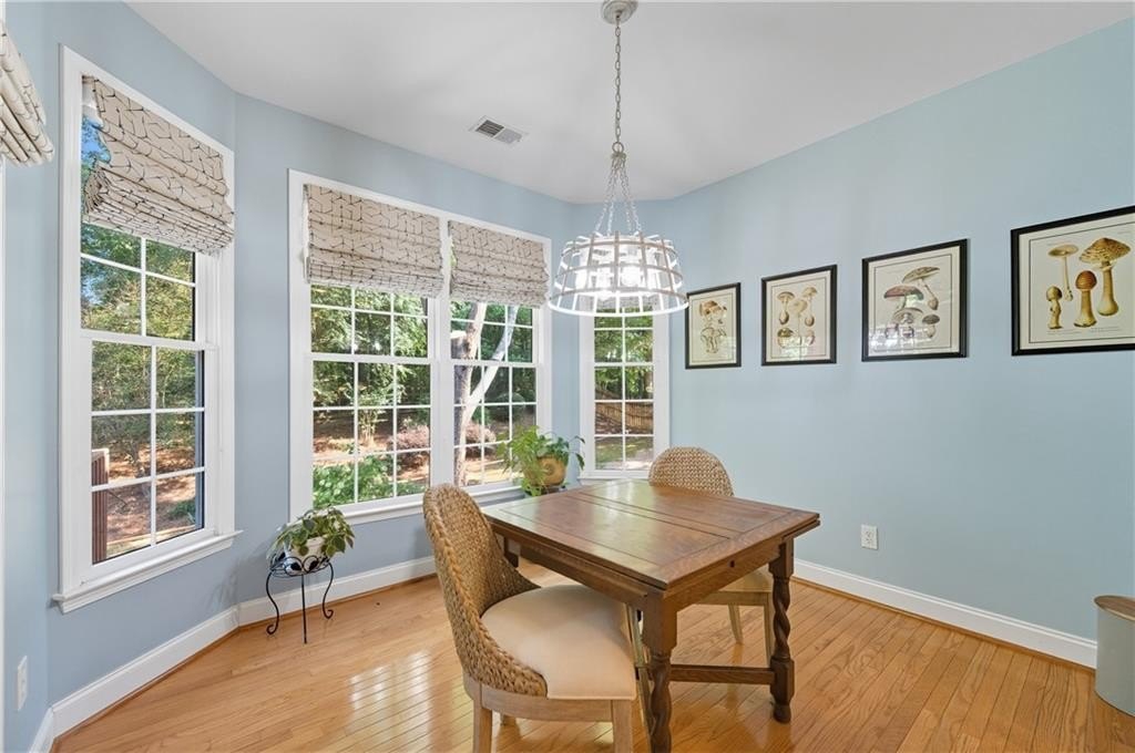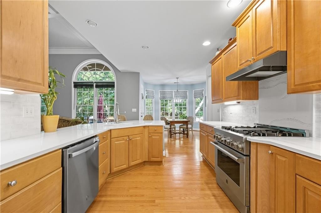 The open layout is anchored by rich hardwood floors and a bright, inviting living space. The chef’s kitchen features an upgraded JennAir stove, generous counter space, and a sunny breakfast room overlooking the private backyard. It flows perfectly into the spacious living room, making everyday living and entertaining feel effortless.