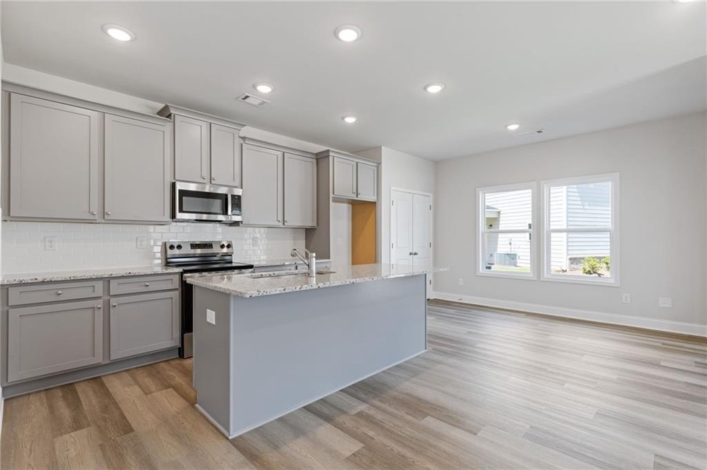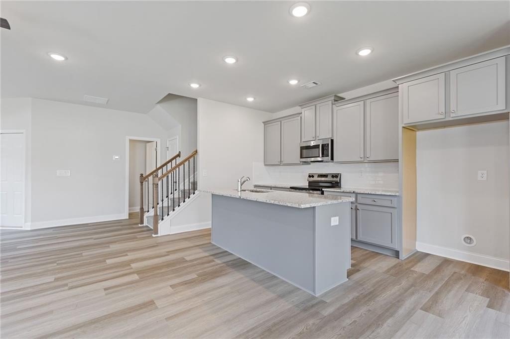 Lot 61- Stockton End Unit- Ready Now- Welcome to the Stockton Floor Plan-a fresh new design offering comfort, flexibility, and modern style in an all-brick front townhome with energy-efficient all-electric living. Step onto the inviting covered front porch and into a bright, welcoming foyer. The open-concept main level features a spacious kitchen, dining area, and family room with smooth surface flooring and a ceiling fan for added comfort. The covered rear patio offers a peaceful outdoor escape-perfect for relaxing with your favorite drink or building your dream plant corner. A powder room and two-car garage complete the thoughtfully designed main floor. Upstairs, the Stockton offers three bedrooms and an open loft, ideal for extra living space, game day hangouts, a home office, workout area, or a cozy reading retreat. The primary suite includes a tray ceiling, ceiling fan, and a spacious primary bathroom featuring a wide double vanity, linen closet, and a window that brings in warm natural light. The Stockton combines versatility, style, and functionality to create the perfect home for modern living. Come see why this plan stands out at Alcovy Meadows!