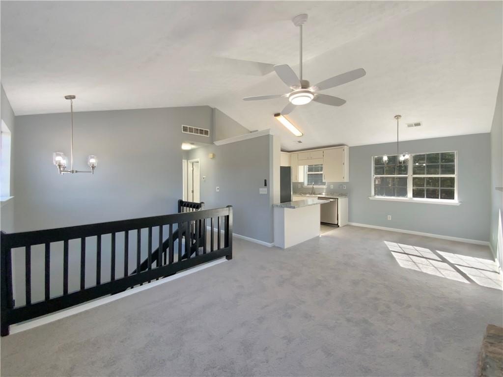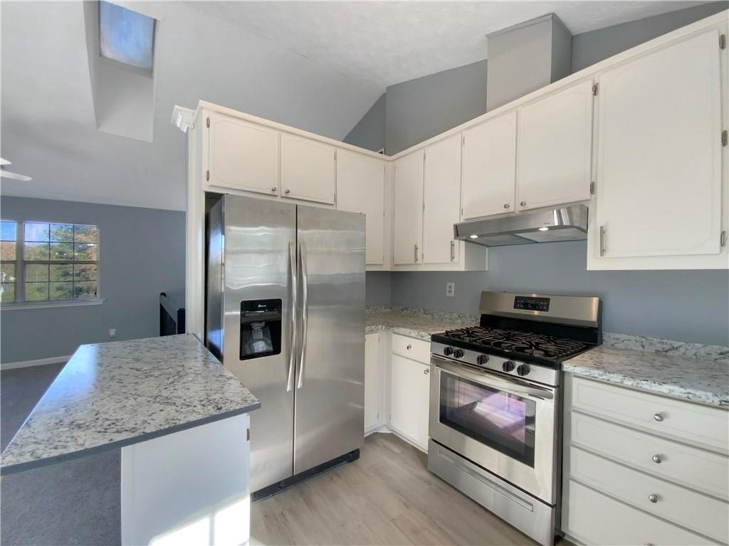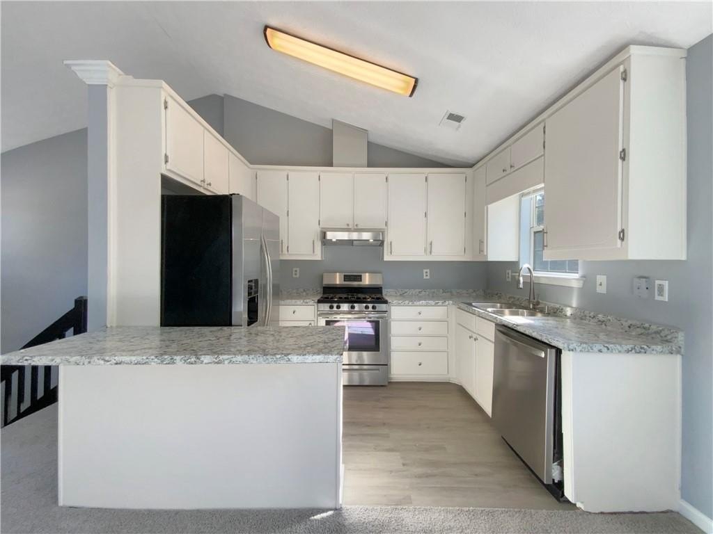 Inside, the home shines with all-new flooring (LVP and carpet), updated lighting, and fresh paint throughout. The kitchen is equipped with stainless steel appliances, a brand-new dishwasher, and a breakfast bar, flowing seamlessly into the dining area. Vaulted ceilings in the family room, dining area, and kitchen create an open, airy atmosphere, while the fireplace in the family room adds warmth and charm.