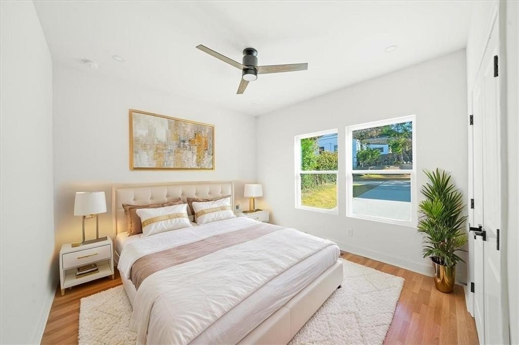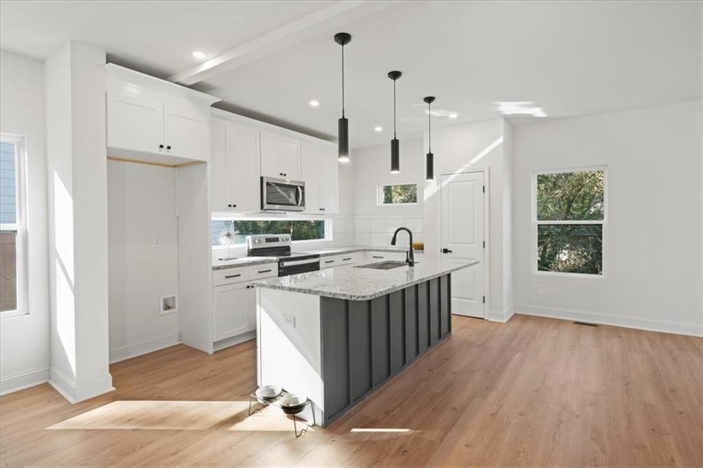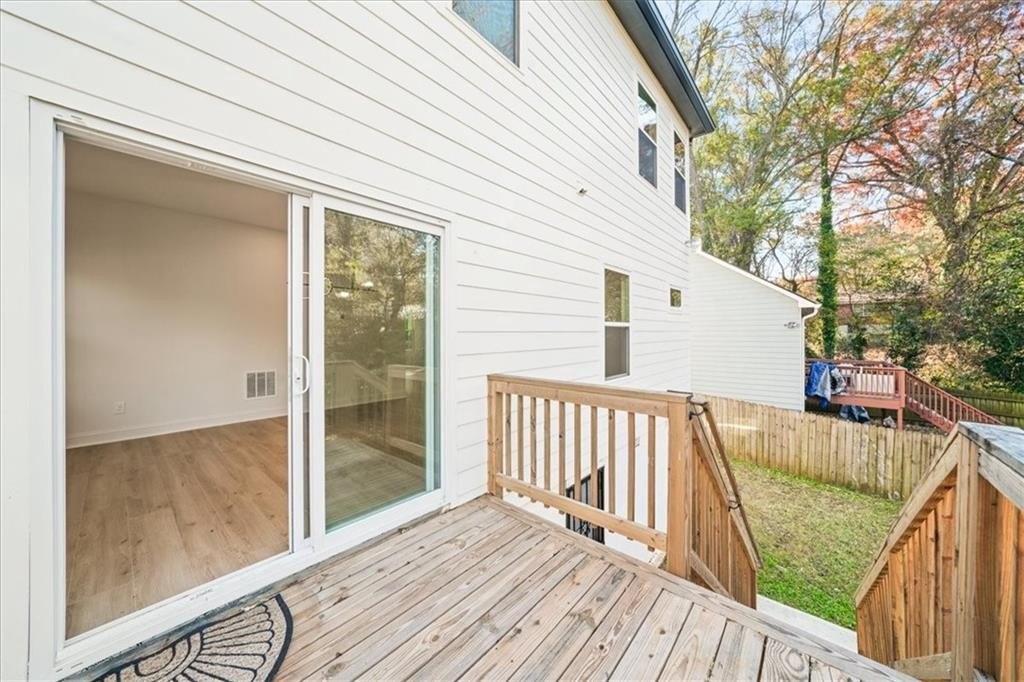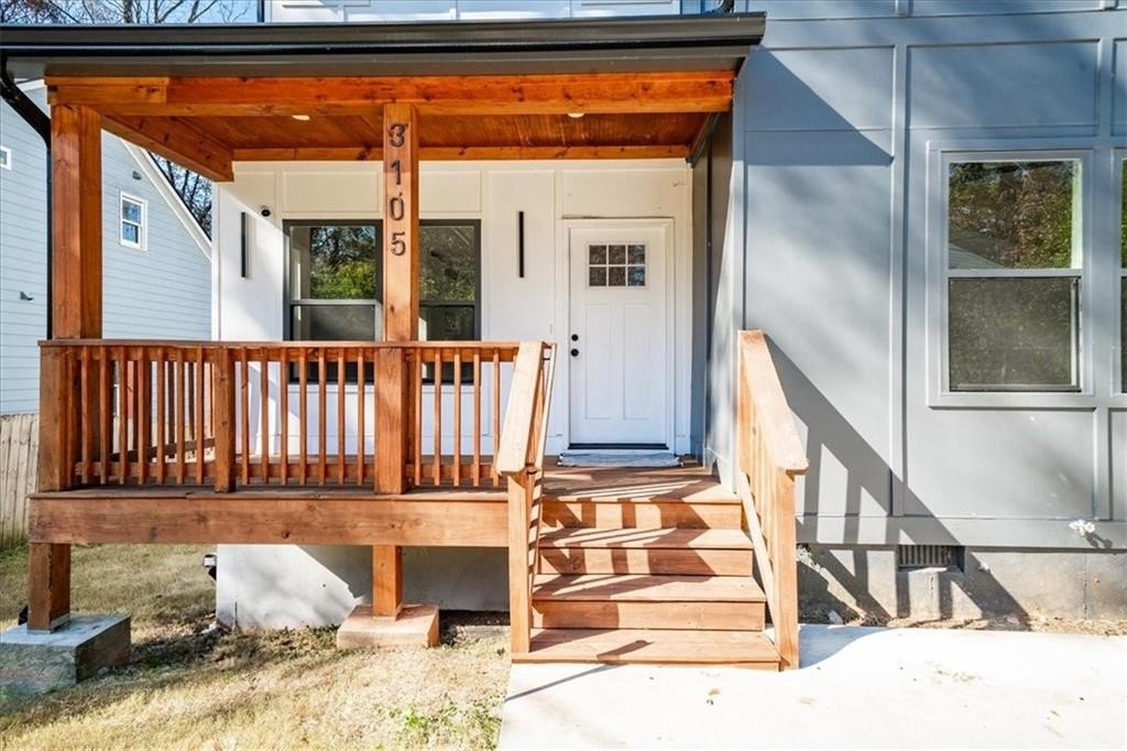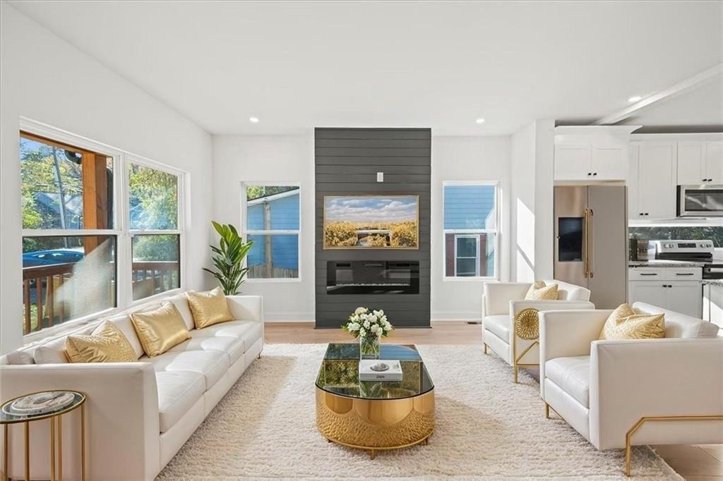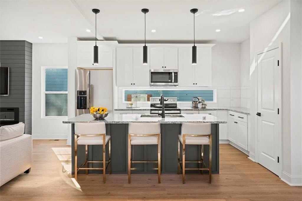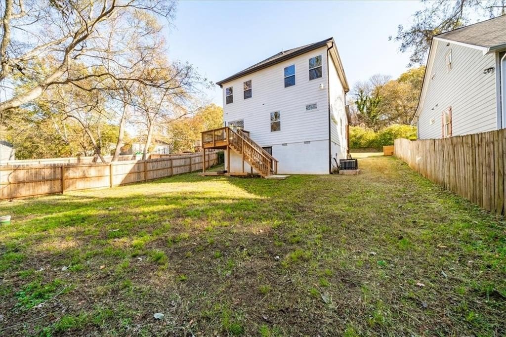 Welcome to this stunning new-construction modern farmhouse, perfectly situated on a highly desirable street in East Point. Offering unbeatable convenience to Tyler Perry Studios, Hartsfield-Jackson Airport, Woodward Academy, and all the best of intown living, this home delivers exceptional style and value at a fantastic price point. Designed with bright, open living in mind, the home features wide-plank LVP flooring throughout, clean modern lines, and abundant natural light streaming in from every direction. The inviting front porch sets the tone, leading into a warm and airy interior. The open-concept main level is anchored by a spacious family room with shiplap accent walls, a sleek modern fireplace, and contemporary lighting. The designer kitchen impresses with white cabinetry, stone countertops, a stylish tile backsplash, and a large island perfect for gathering and entertaining. A convenient guest bedroom on the main level offers flexible space for visitors, a home office, or multi-generational living. Upstairs, the large primary suite offers a peaceful retreat, complete with a tray ceiling, a roomy walk-in closet, and a spa-inspired bathroom featuring a double vanity and modern finishes. Secondary bedrooms are comfortably sized with great natural light. Step outside to a sunny, level backyard—a rare find—ideal for play, pets, gardening, or future outdoor enhancements. The back deck overlooks the grassy lawn and makes the perfect spot for morning coffee or evening grilling. With its stylish modern farmhouse design, exceptional natural light, and prime location close to everything, this home offers intown lifestyle living at an incredible value. Don’t miss your chance to make this beautiful new construction yours!