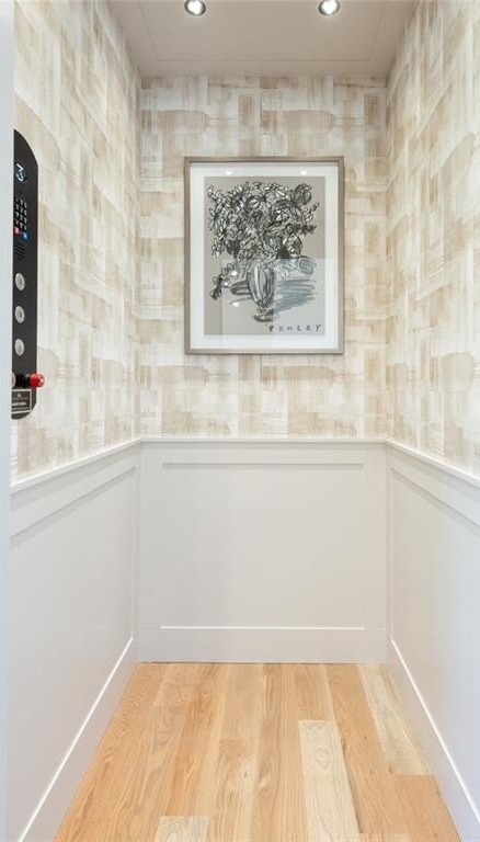Acoustic wooden accent walls add warmth to the Living, Keeping, and Breakfast rooms. In the Living Room, custom built-ins and open shelving pair with a striking fireplace for a sophisticated gathering space. The main-level guest suite features designer finishes and a zero-entry shower. The centrally located elevator provides effortless access to all floors.