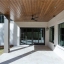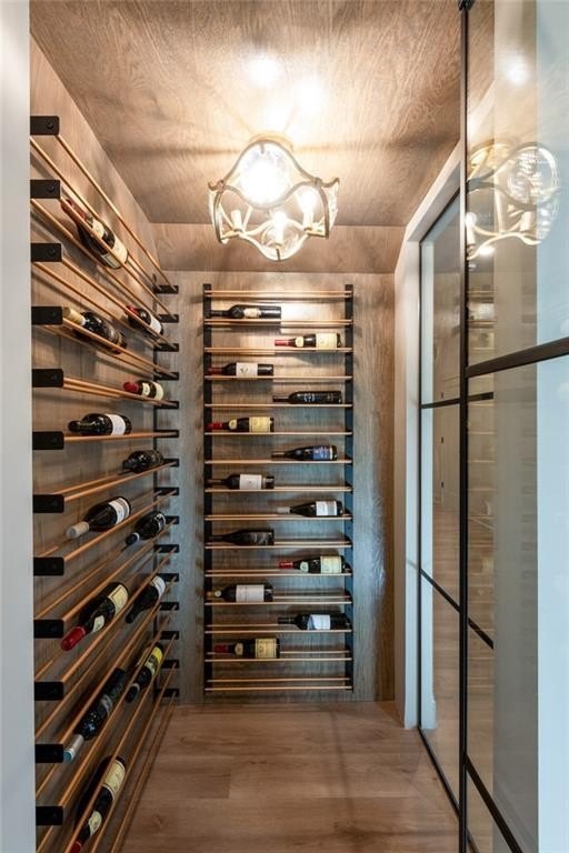 The entertainment lounge features a sophisticated wet bar with wine and beverage refrigeration, an ice maker, and glass-front cabinetry. A modern wine show case with decorative racking elevates both the style and functionality of the bar. Pella sliding glass doors open to a covered porch overlooking the flat lower lawn—ideal for play, gatherings, and indoor–outdoor entertaining.