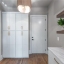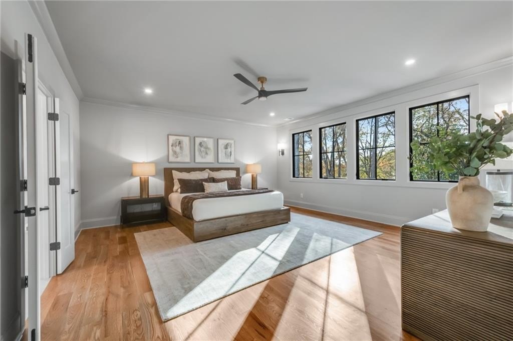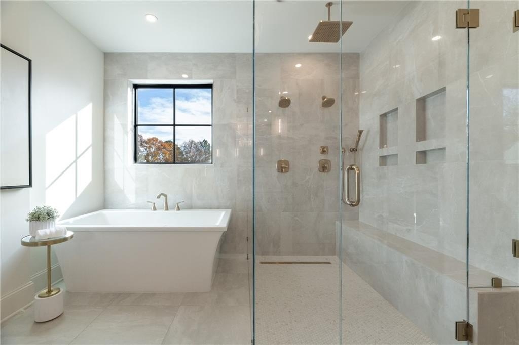 Upper Level: The serene owner’s suite includes an oversized bedroom with hardwood flooring, ample space for a sitting area, plus a spa-inspired bath with zero-entry shower, soaking tub, heated tile floor, and a custom walk-in closet.