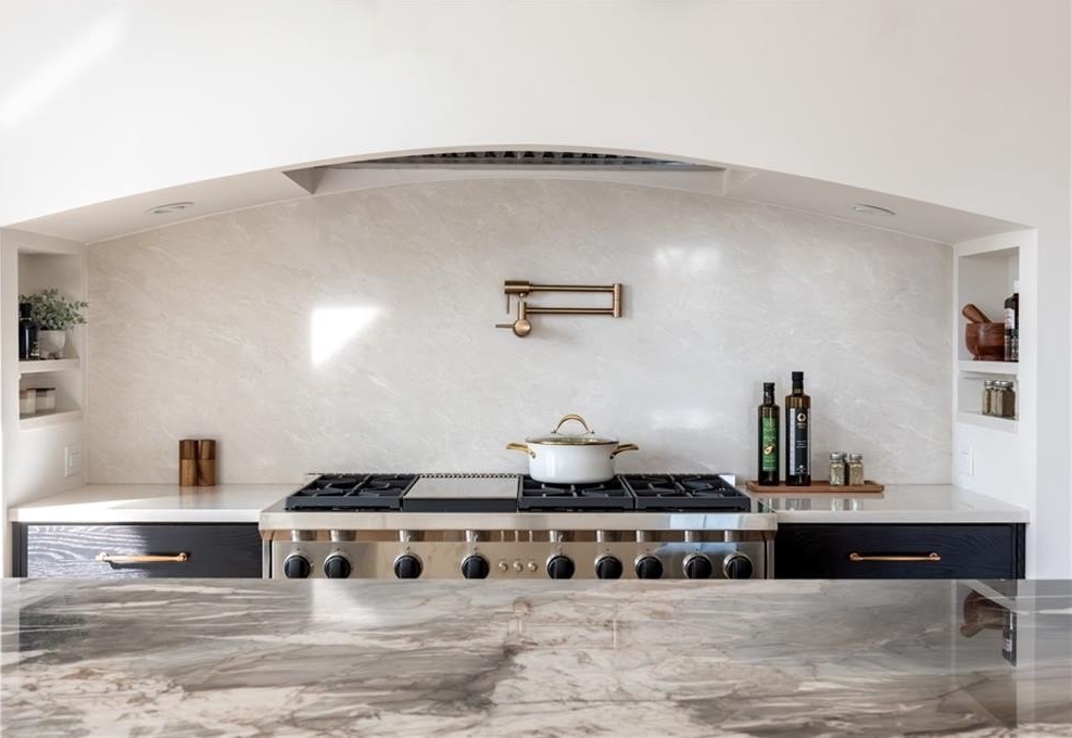 Main Level: An enhanced floor plan with 10' ceilings, statement lighting, and expansive casement windows fill the home with natural light. The professional grade kitchen is the centerpiece, offering a stunning oversized quartzite island, quartz countertops, a custom cooking alcove with Pro-Style Wolf range, Sub-Zero refrigerator and freezer towers, Sub-Zero beverage cooler, Cove dishwasher, and a scullery with its own refrigerator and dishwasher for added prep and storage.