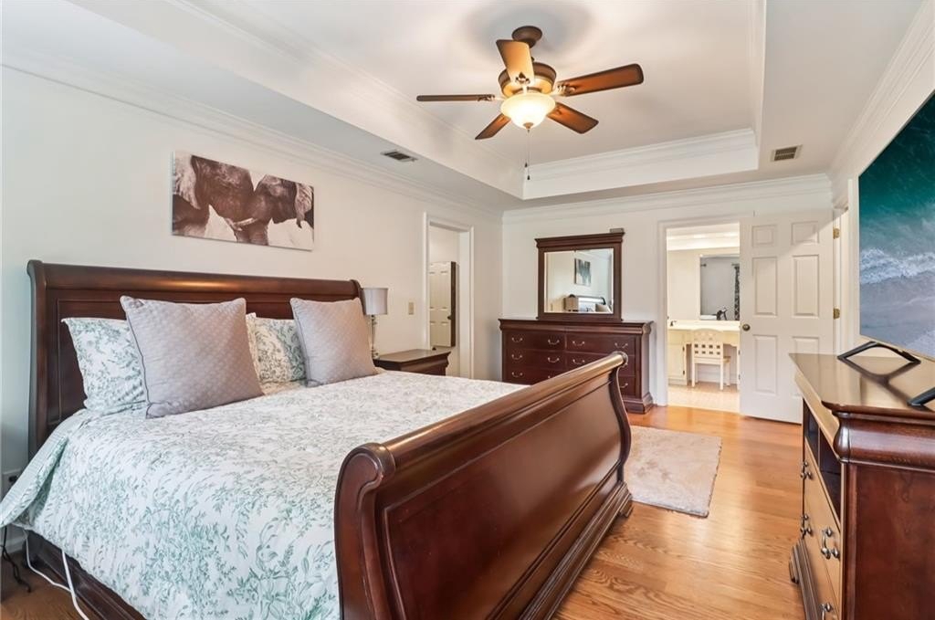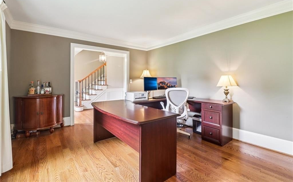 ***Priced to Sell***New Exterior Paint & Windows***Bonus Room***Finished Basement***This elegant home sits on a large, private lot with mature trees and beautifully maintained landscaping. Inside, rich hardwood floors flow throughout the main level. A formal dining room and living room flank the foyer, while the inviting family room features a floor-to-ceiling brick fireplace and a wall of windows overlooking the serene backyard. The updated kitchen features granite countertops, white cabinetry, a tile backsplash, stainless steel appliances, a large island, and a bright breakfast room. A spacious laundry room with granite counters and a half bath complete the main level. Upstairs, the oversized primary suite offers hardwood floors, dual closets, and a luxurious bath with double vanities, soaking tub, and separate shower. A private bonus room—accessible from the suite or its own staircase—makes an ideal office or flex space. Three additional bedrooms with hardwood floors share a full hall bath with dual sinks. The partially finished terrace level provides two large living areas (one with outdoor access), a bedroom, and a full bath—perfect for a guest suite, media room, or home office. Outdoors, enjoy the freshly stained upper deck, covered patio, and fenced backyard. Recent upgrades include: gutters with leaf guards, sprinkler system, outdoor lighting, imported mahogany double front door, new paint, and new windows. Don't miss your opportunity - book your tour today!
