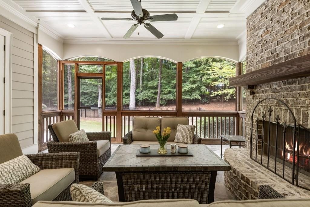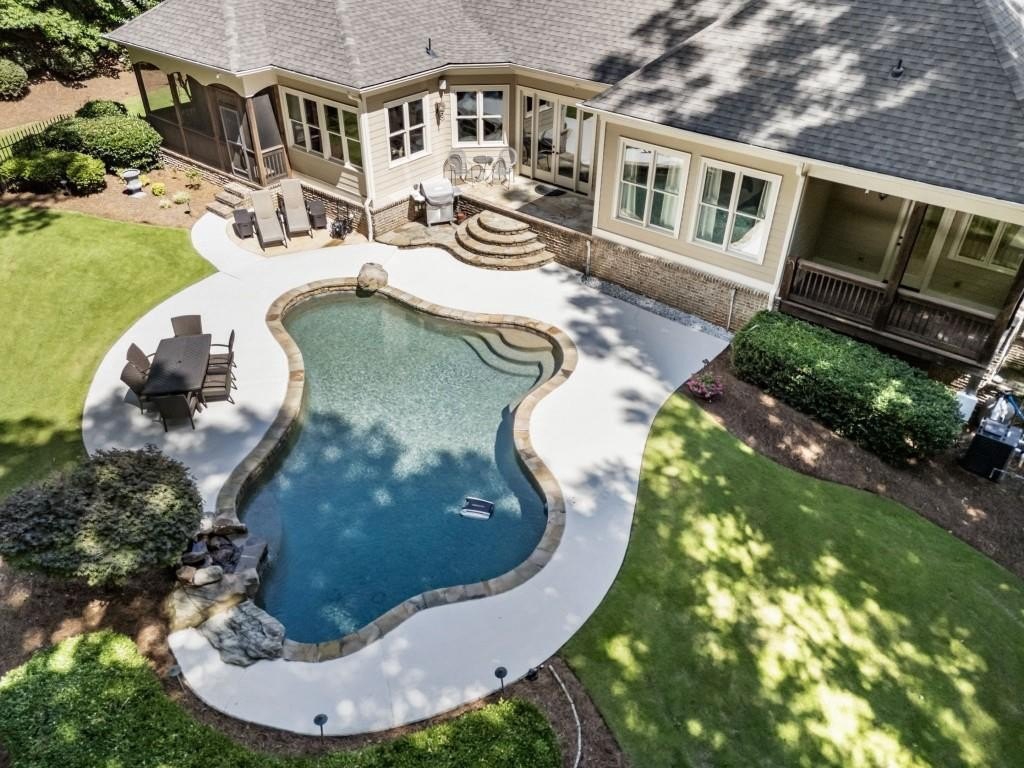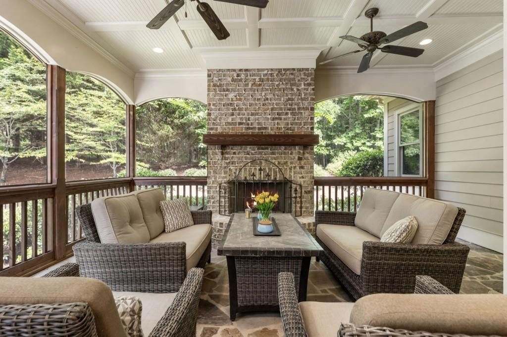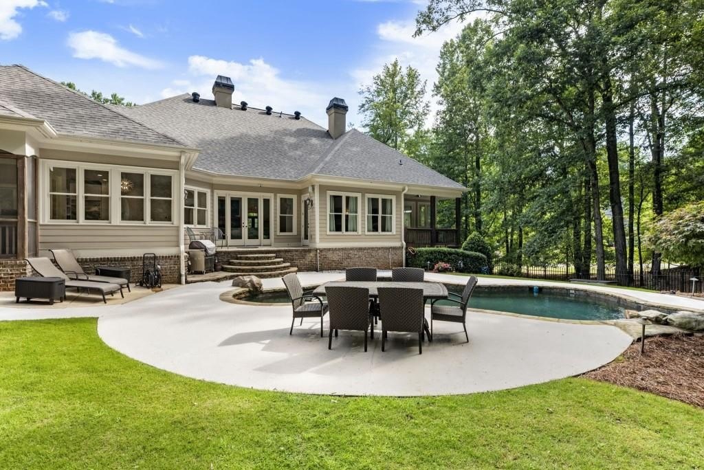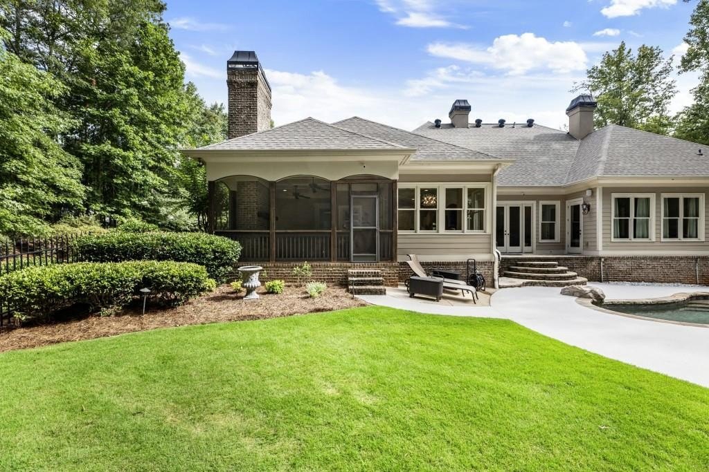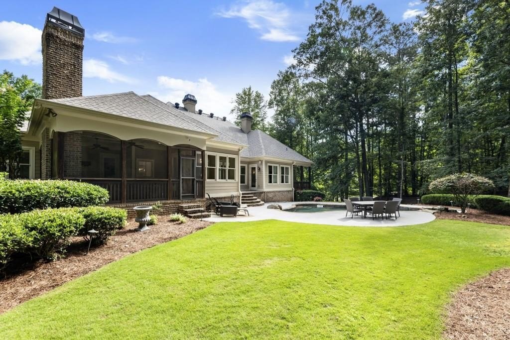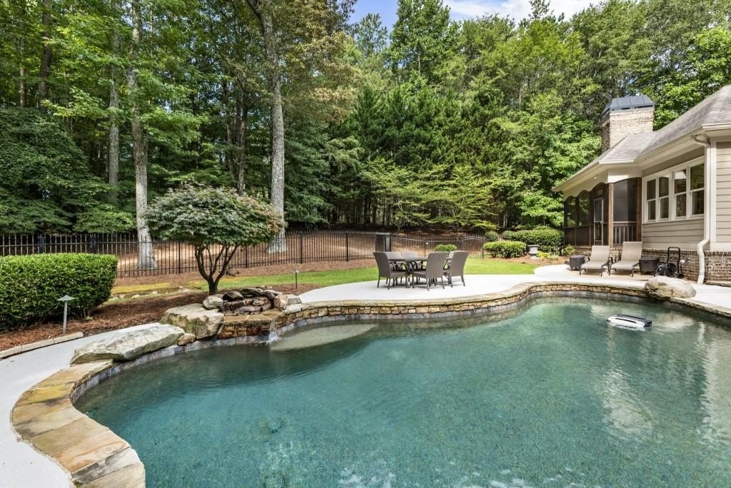 Beautifully updated in this gated community in sought after South Forsyth location! This one level ranch style home offers walk-out on the main level to your outdoor living space featuring a gunite sparkling pool, a screened porch with fireplace, and lots of outdoor entertaining space. This home is located in Forsyth county and situated at the end of a quiet cul-de-sac in gated enclave of luxury homes offering you security and serenity in an ideal location. The covered front porch offers a warm welcome and sets the tone for the comfort and quality found throughout the property. Upon entering through the front door, you are greeted by a dining room on your right and a private study on your left, complete with built-in bookcases and access to the primary bedroom. The heart of the home features an open-concept kitchen design with this oversized island that offers seating and open concept while being a completely modernized kitchen with all new appliances, counter tops, backsplash and more. A stone fireplace serves as a warm and welcoming focal point in the living room and perfect for both everyday living and entertaining. Just off the kitchen, a screened-in back porch with its own fireplace offers a comfortable outdoor living space that can be enjoyed year-round. The primary suite is a peaceful and well-appointed space with windows overlooking the private backyard. The primary bathroom features separate dual vanities, two walk-in closets, and a large walk-in shower and soaking tub. A private bonus room, currently used as a home gym, adds function and flexibility. A second bedroom with ensuite is also located on the main floor. The fully finished basement includes two additional bedrooms, two full bathrooms, one half bathroom, a generous media room, and a wet bar. The lower level offers multiple flexible living spaces ideal for craft room, media space, movie room, ping pong or pool table room perfect for entertaining & hosting guests. Every major system has been thoughtfully updated including pool heater, HVAC, water heaters, roof replaced and freshly painted interior with all bathrooms and the kitchen perfectly updated. The new garage epoxy floor was recently finished. This home offers timeless design, modern upgrades, and a serene setting. Minutes to GA 400, and shopping/dining at The Collection, Halcyon, and Avalon. Enjoy living with the convenience of Fowler Park and the Greenway right outside your community.