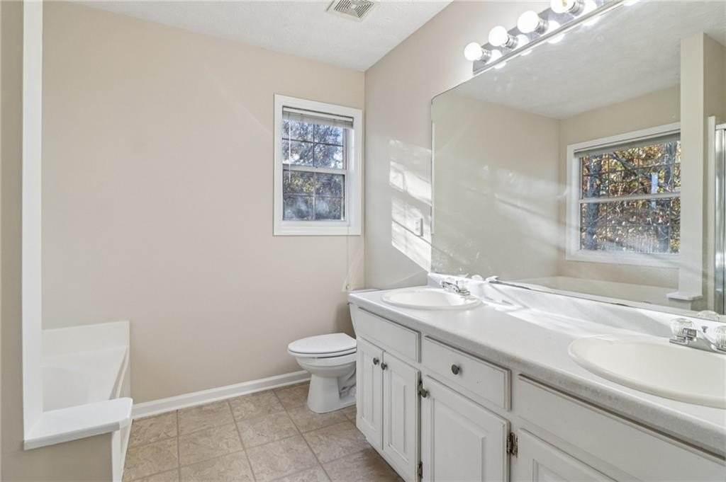 The spacious primary suite is conveniently located on the main level and features an ensuite bathroom with a double vanity, separate shower, and relaxing soaking tub. Two additional bedrooms and a full bathroom complete the main floor layout.