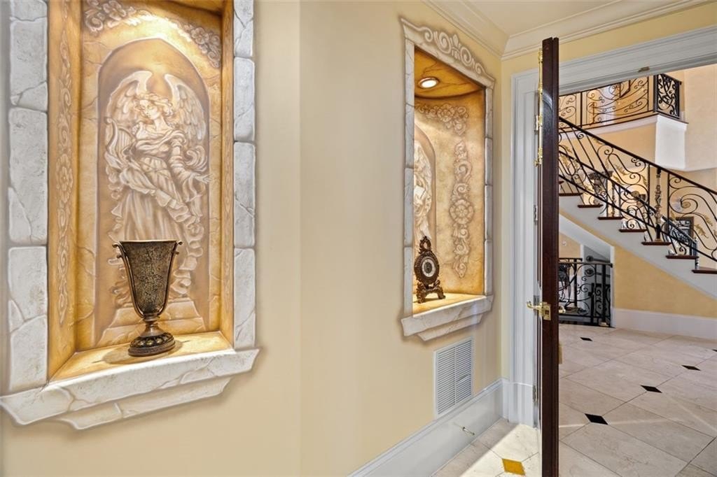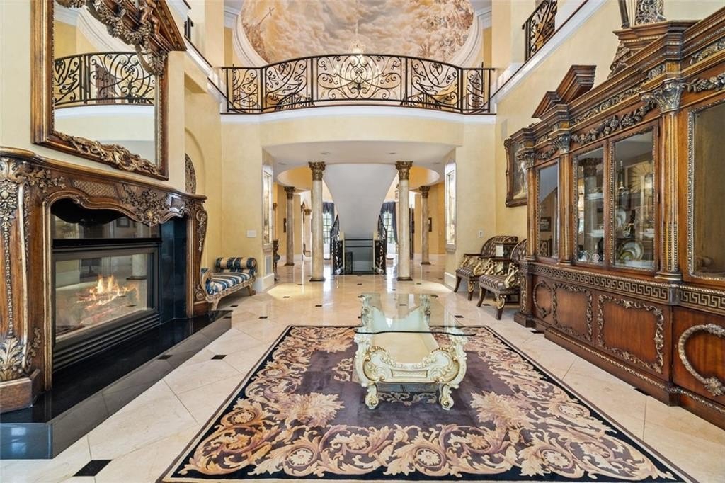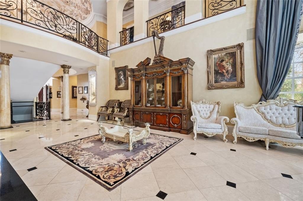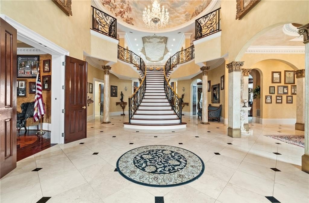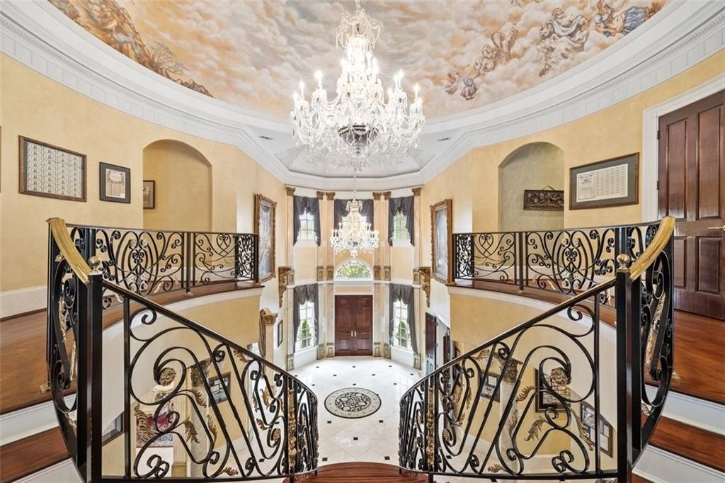 The façade, framed by Corinthian columns and classical detailing, establishes a rhythm of strength and grace. Inside the main house, a grand foyer sets the tone with an elegant statement staircase, intricate ceiling murals, and a custom chandelier, all supported by a discreetly integrated home elevator that provides convenient access to every level.