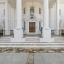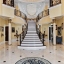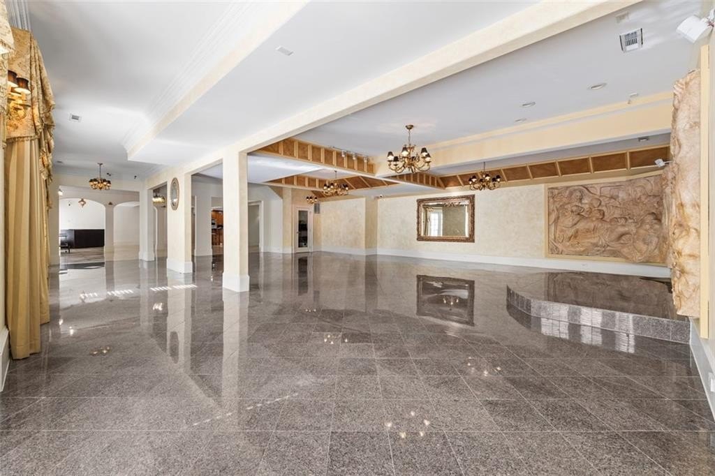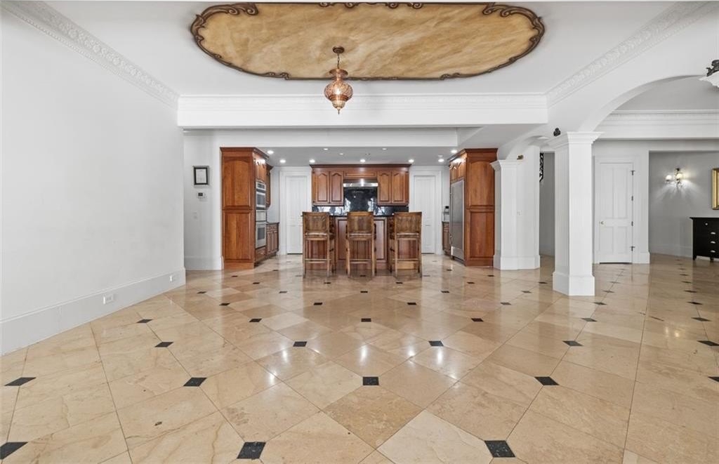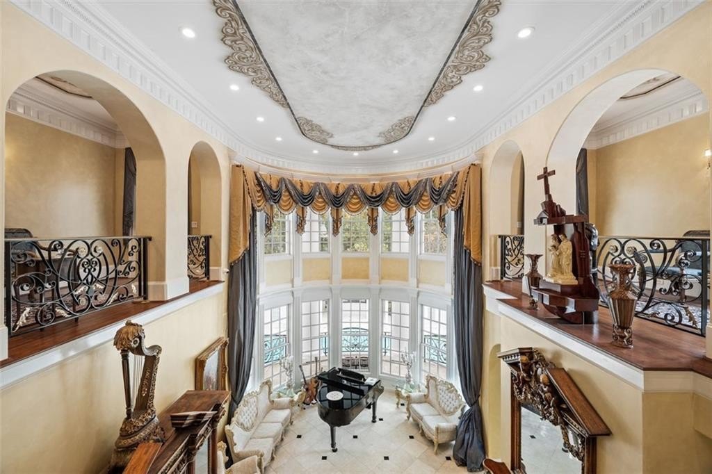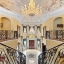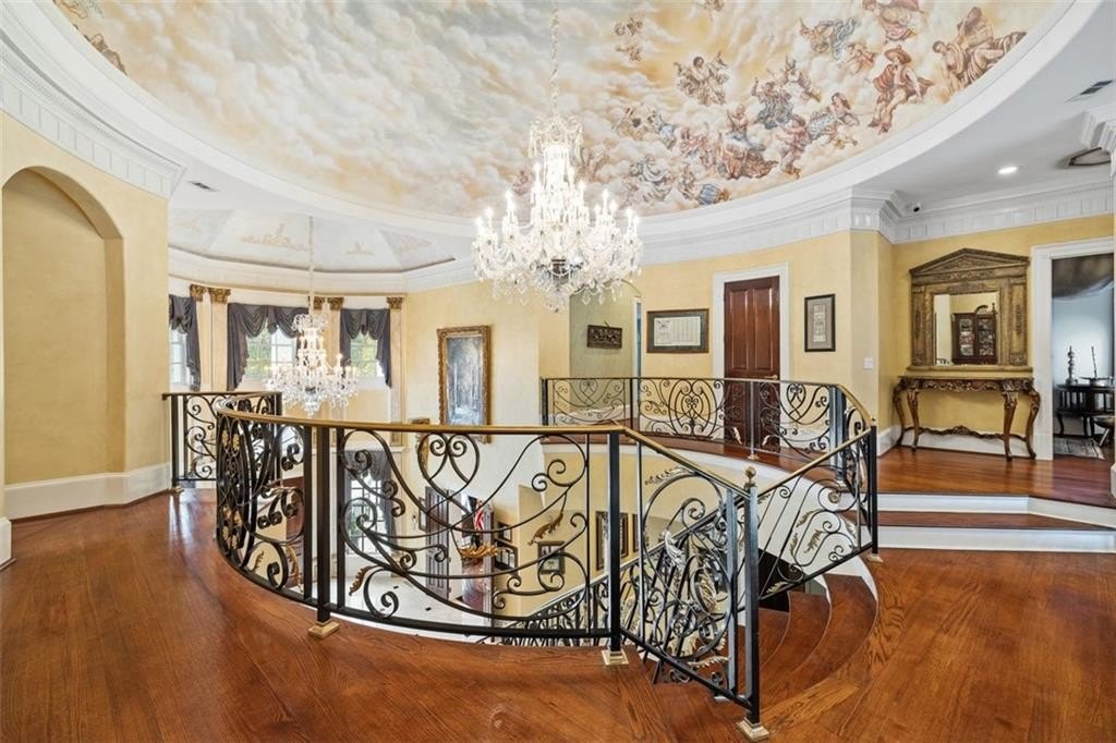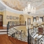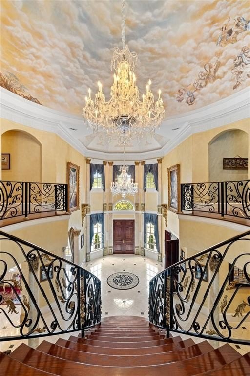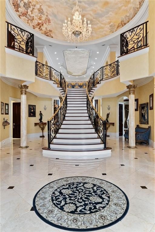The façade, framed by Corinthian columns and classical detailing, establishes a rhythm of strength and grace. Inside the main house, a grand foyer sets the tone with an elegant statement staircase, intricate ceiling murals, and a custom chandelier, all supported by a discreetly integrated home elevator that provides convenient access to every level.