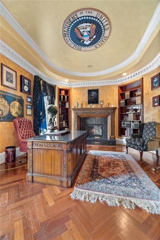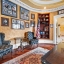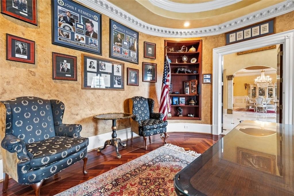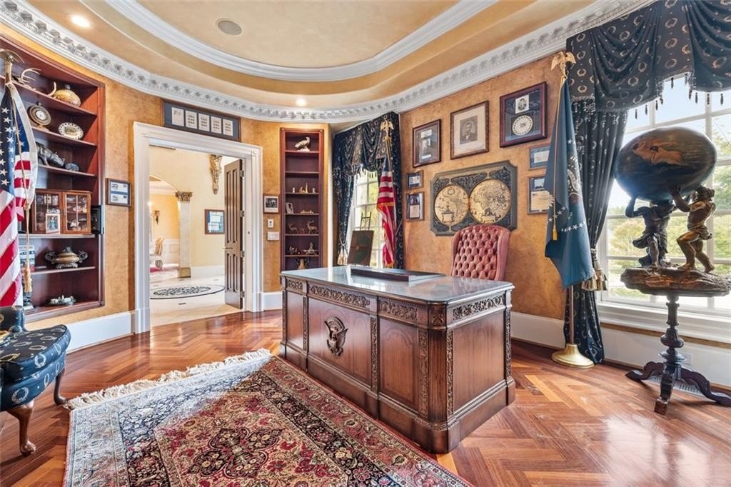 At the heart of the primary level is the home’s most defining space - its Oval Office, featuring the Presidential Seal displayed prominently on the ceiling and a custom desk crafted by the same manufacturer who built the President’s Resolute Desk. Modeled after its namesake in Washington, this room was created for reflection, respect, and meaningful conversation, anchored by a stately fireplace that reinforces its dignity and purpose.