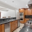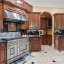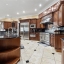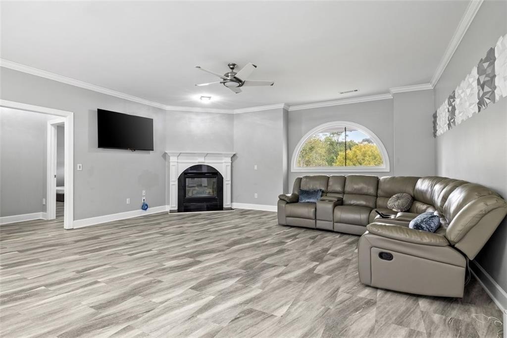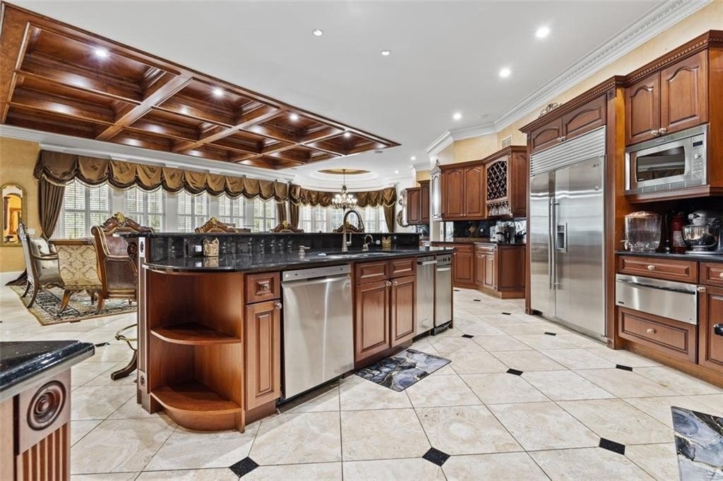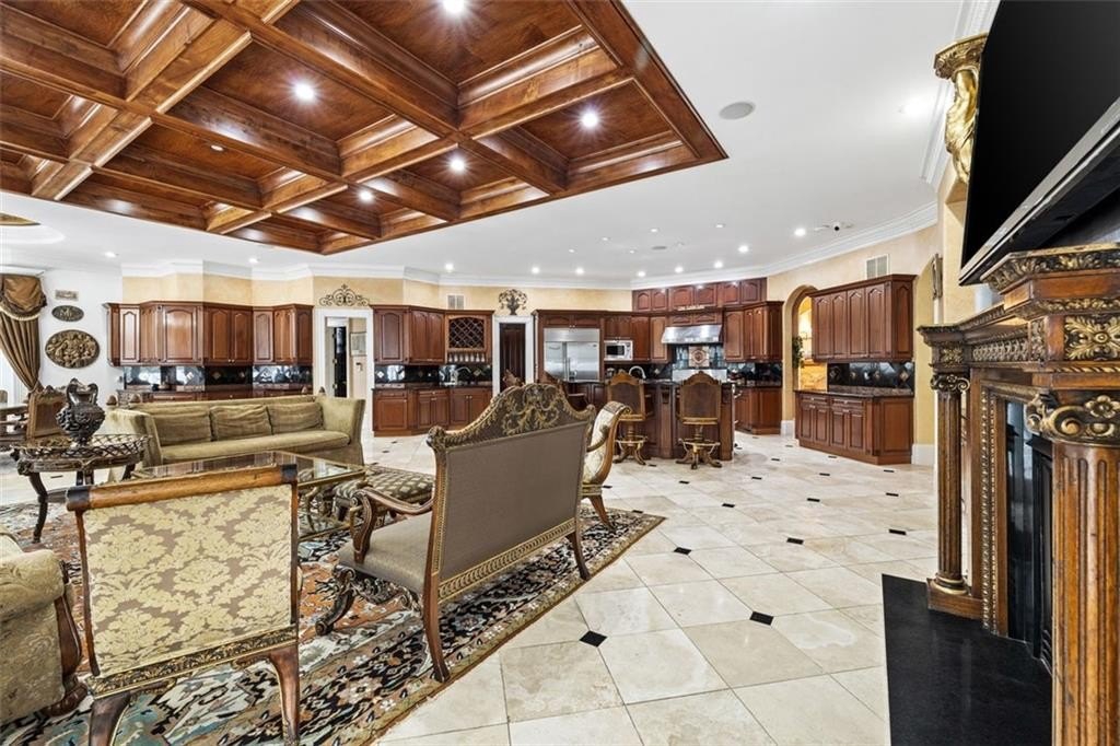 At the center of the home lies the grand family room and kitchen, featuring coffered ceilings, rich wood detailing, a fireplace, and abundant natural light from a wall of windows and an oversized bay window framing the eat-in area.