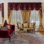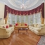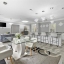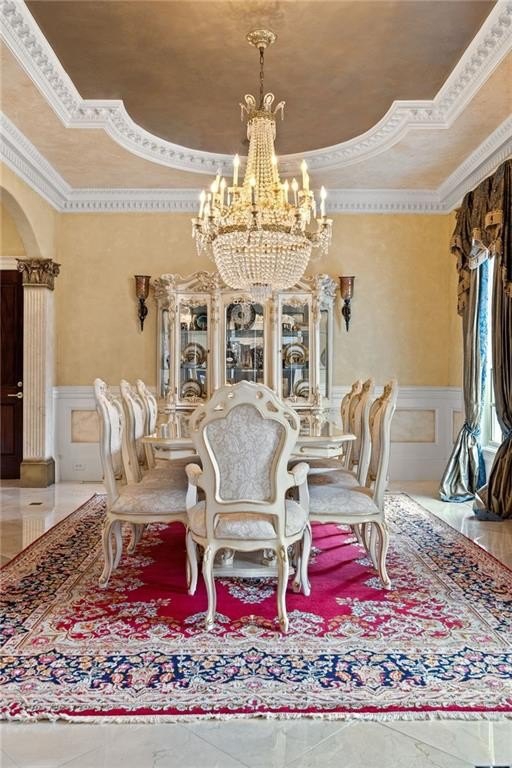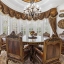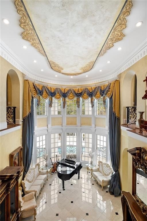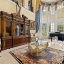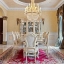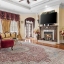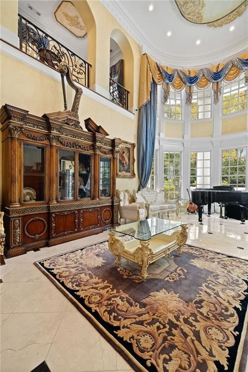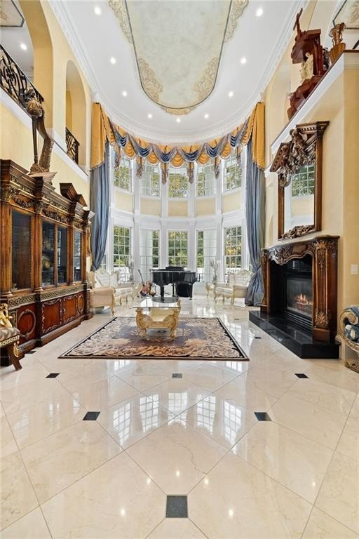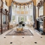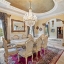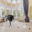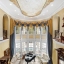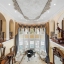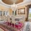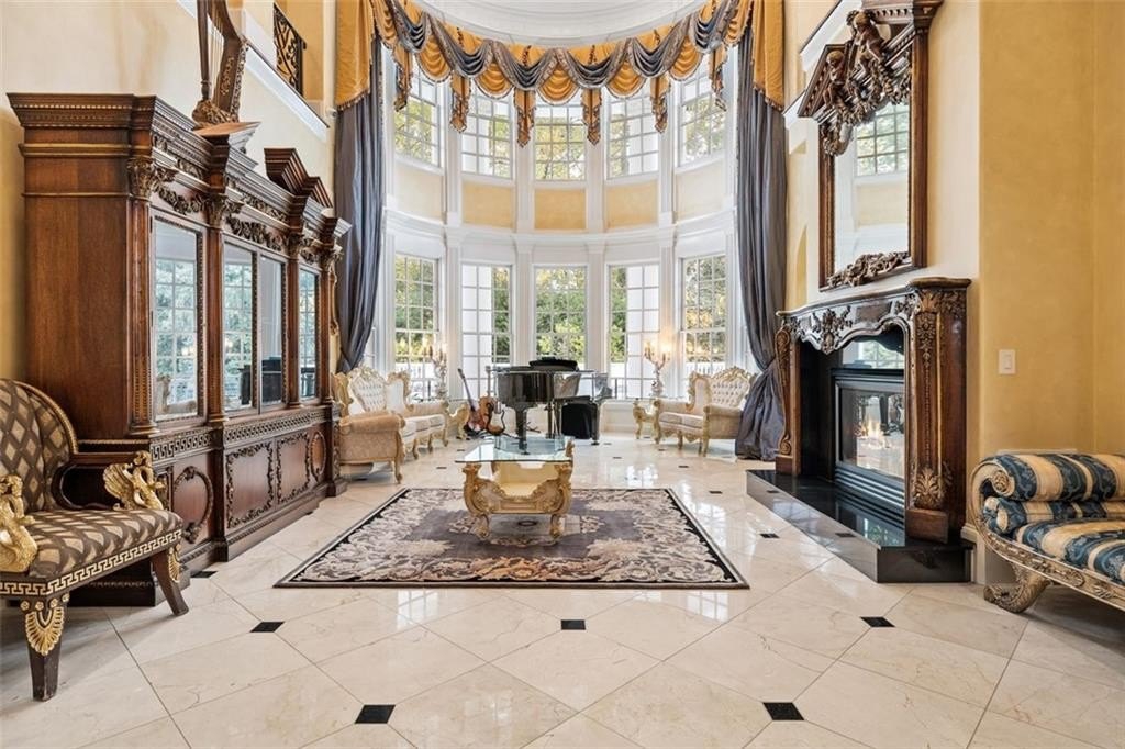 The formal dining room is draped in luxurious fabrics and gold accents, designed for ceremonial entertaining. Nearby, the parlor and piano salon rise through two stories of glass with sweeping views of the pool and gardens. An oversized double fireplace, shared with the adjoining family room, balances architectural drama with warmth.