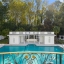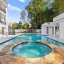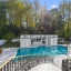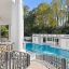 Beyond the interiors, the rear elevation reveals breathtaking symmetry. Twin staircases descend from the terrace to manicured gardens, an oversized pool and Jacuzzi, and a dedicated pool house featuring an outdoor kitchen and an additional half bath, creating a setting ideal for private events and large-scale entertaining.
