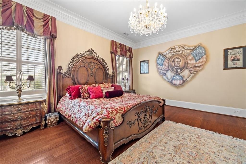 The primary suite occupies its own wing with dual seating areas, a fireplace, an oversized spa-like bath, and a hand-painted mural. Additional bedrooms throughout the home draw inspiration from the Queen’s Bedroom and Lincoln Bedroom, each crafted with character and grace.