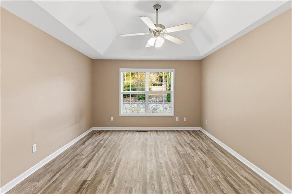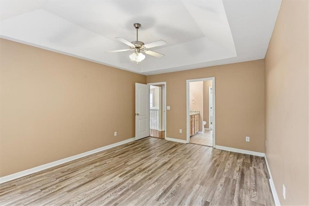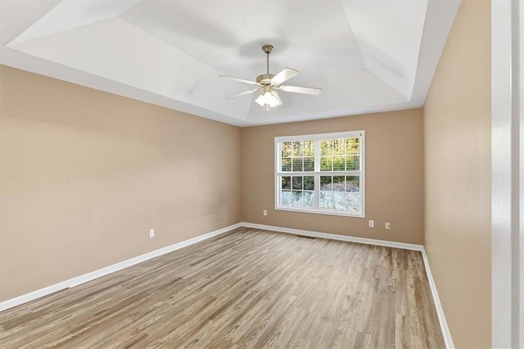 The spacious primary suite offers new flooring, tray ceilings, an oversized closet, master bath with a double vanity, soaking tub, and separate shower. An updated secondary bathroom adds even more modern convenience. Two additional secondary bedrooms on the main level.