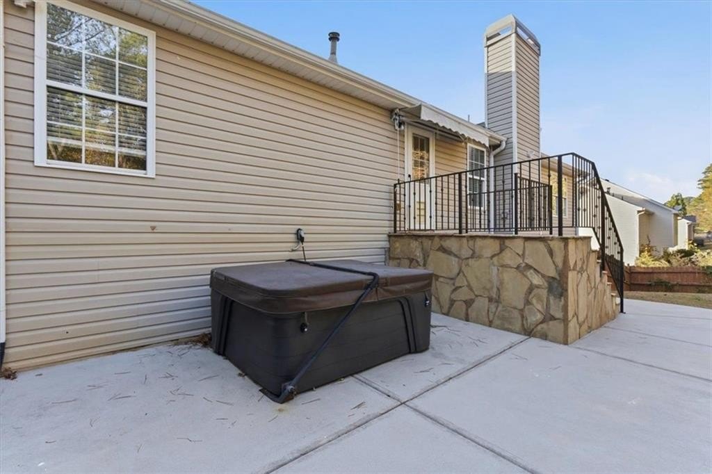 Step outside to your expansive, private, fenced-in backyard featuring a beautiful stone wall and patio with hot tub—an ideal setting for outdoor dining, relaxing, or hosting gatherings.