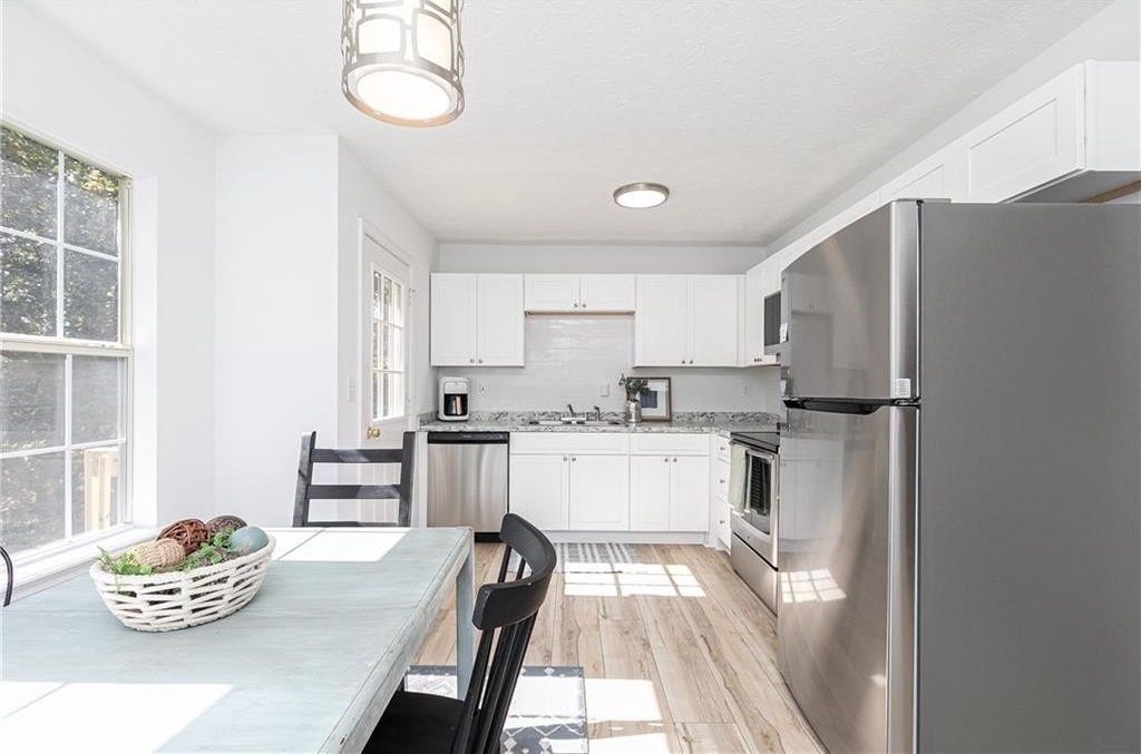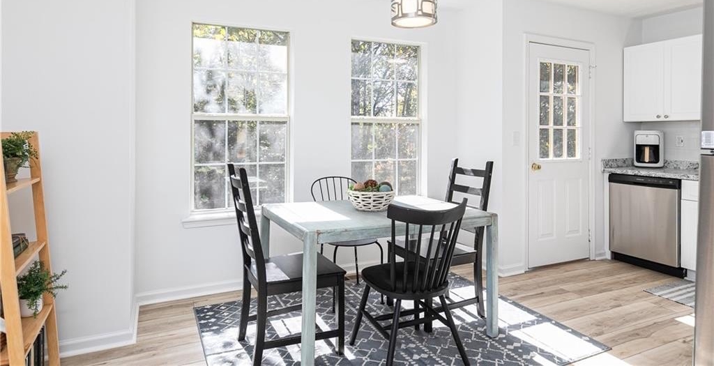 The heart of the home features a completely renovated kitchen with crisp white cabinetry, new countertops, stainless steel appliances, and a sunny dining area overlooking the trees. The spacious family room is filled with natural light, perfect for relaxing or entertaining.
