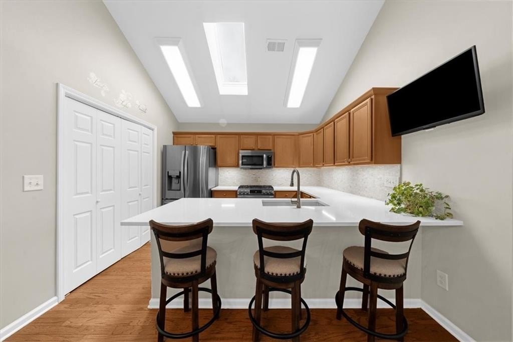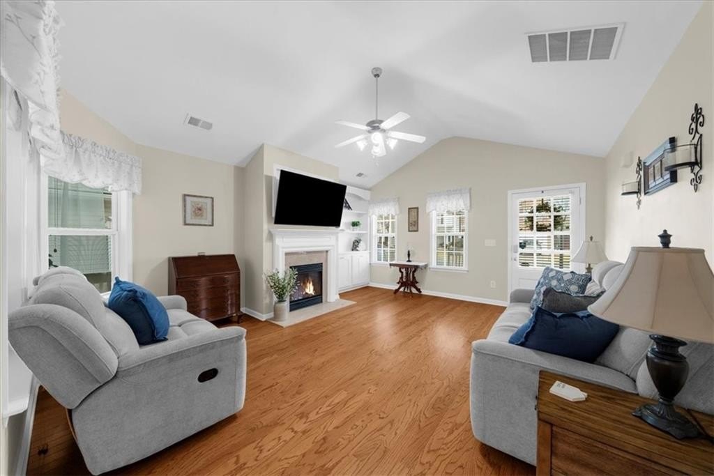 This inviting home features an incredible ranch floor-plan filled with natural light, creating a warm and welcoming atmosphere throughout. Enjoy effortless indoor-outdoor living with a generously sized screened-in side patio that opens to a level, private backyard which is perfect for enjoying all four seasons! Inside, the spacious living area seamlessly flows into the kitchen and dining spaces, ideal for entertaining or everyday comfort. The primary suite features a sitting room, vaulted ceiling, oversized walk-in closet, private en-suite bathroom, and direct access to the private side patio. Thoughtful storage spaces are located throughout the home for everyday convenience and functionality.