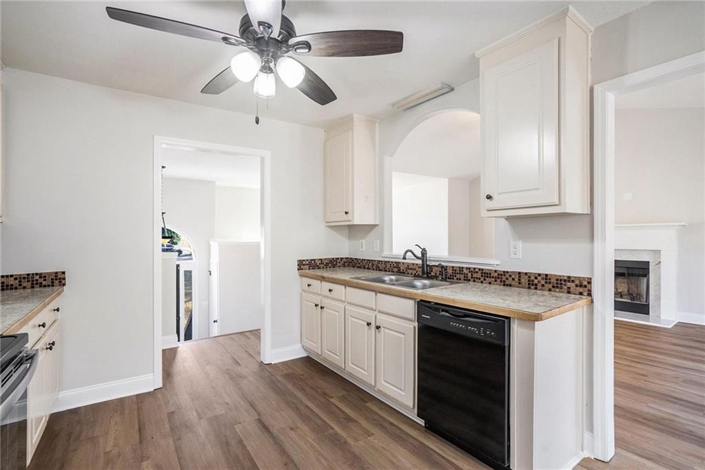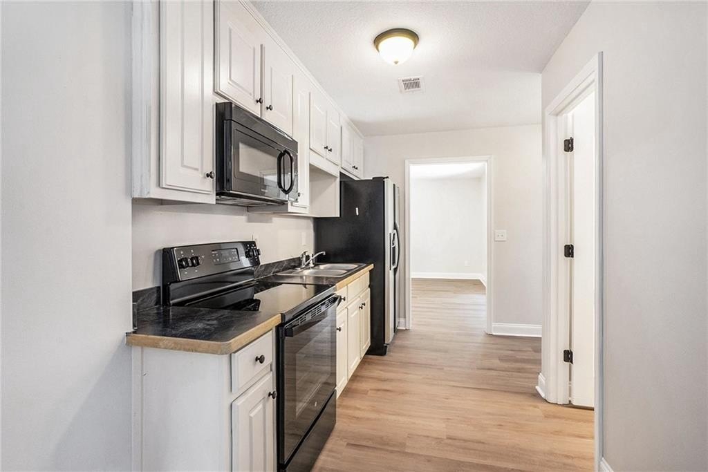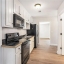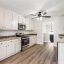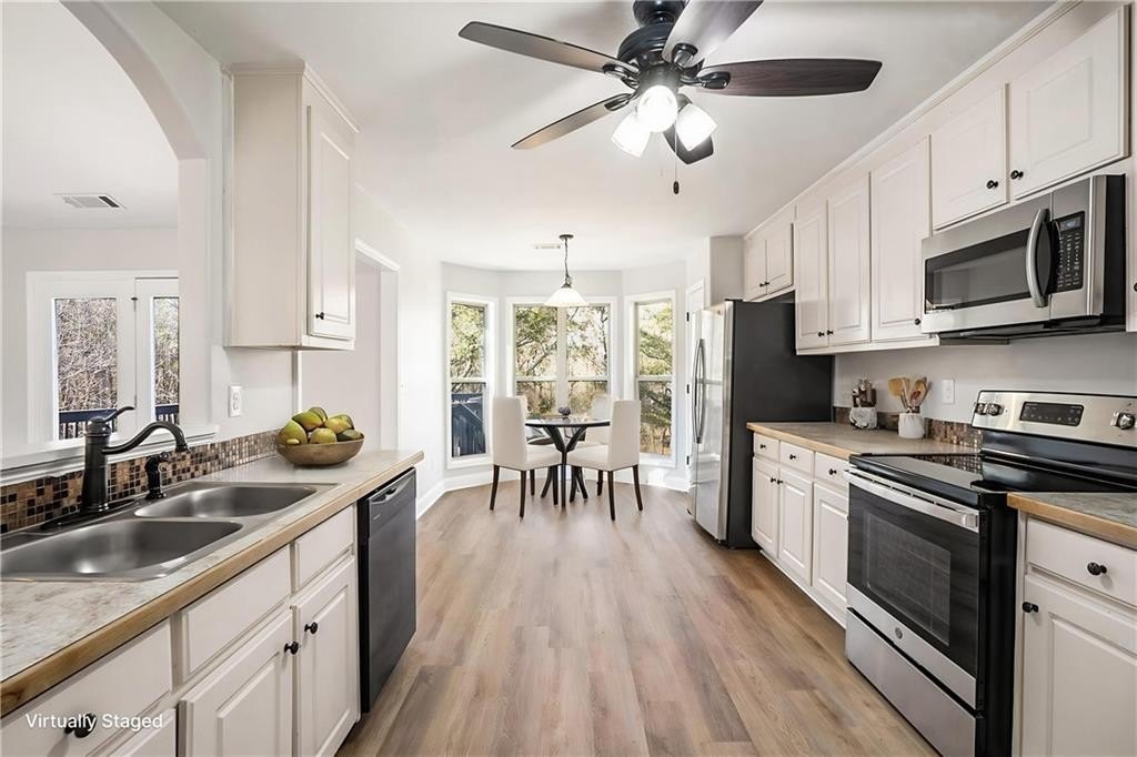 natural light. The kitchen features white cabinetry, stainless steel appliances, and plenty of cabinet and counter space for