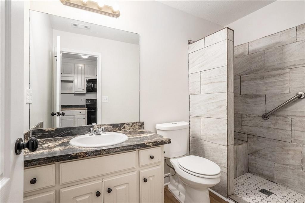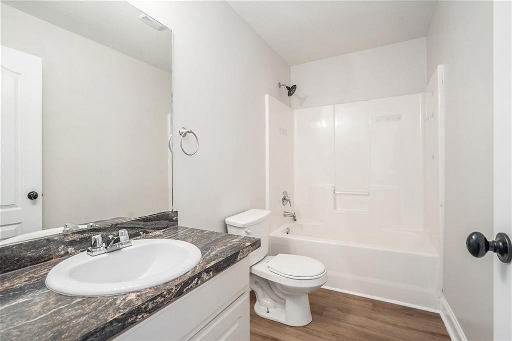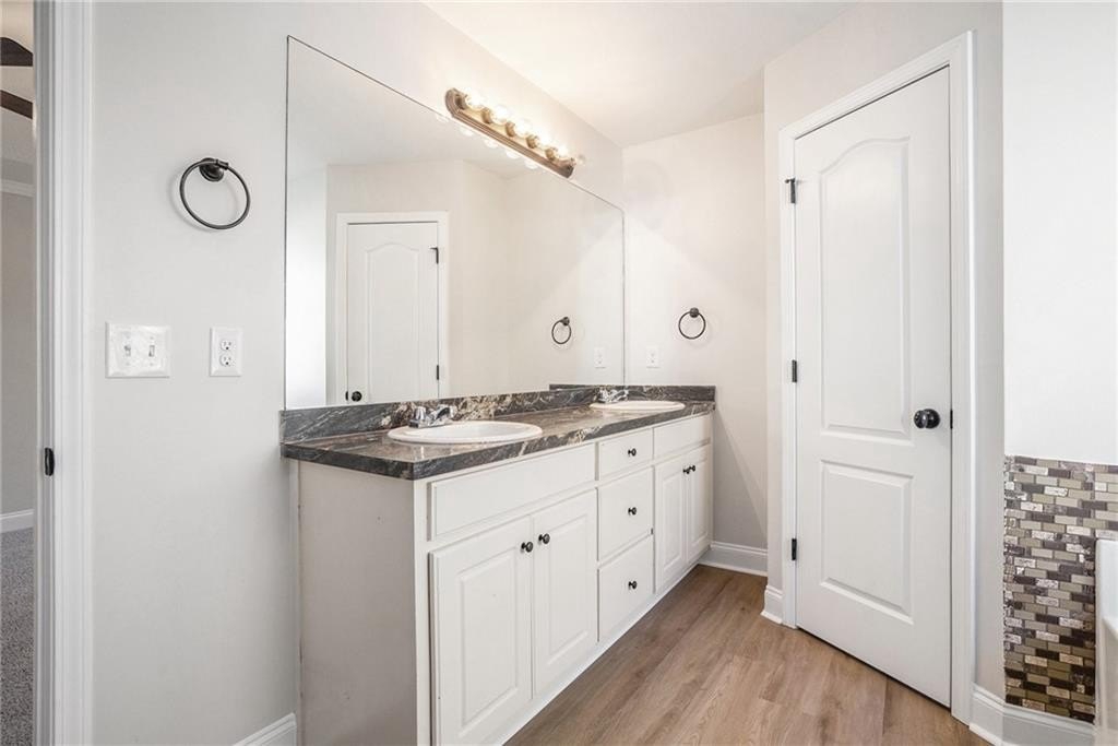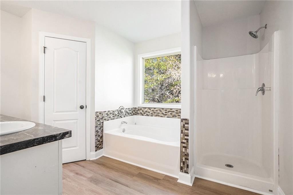 a double vanity, separate soaking tub, and walk-in shower. Two additional bedrooms on this level share a full bath,