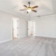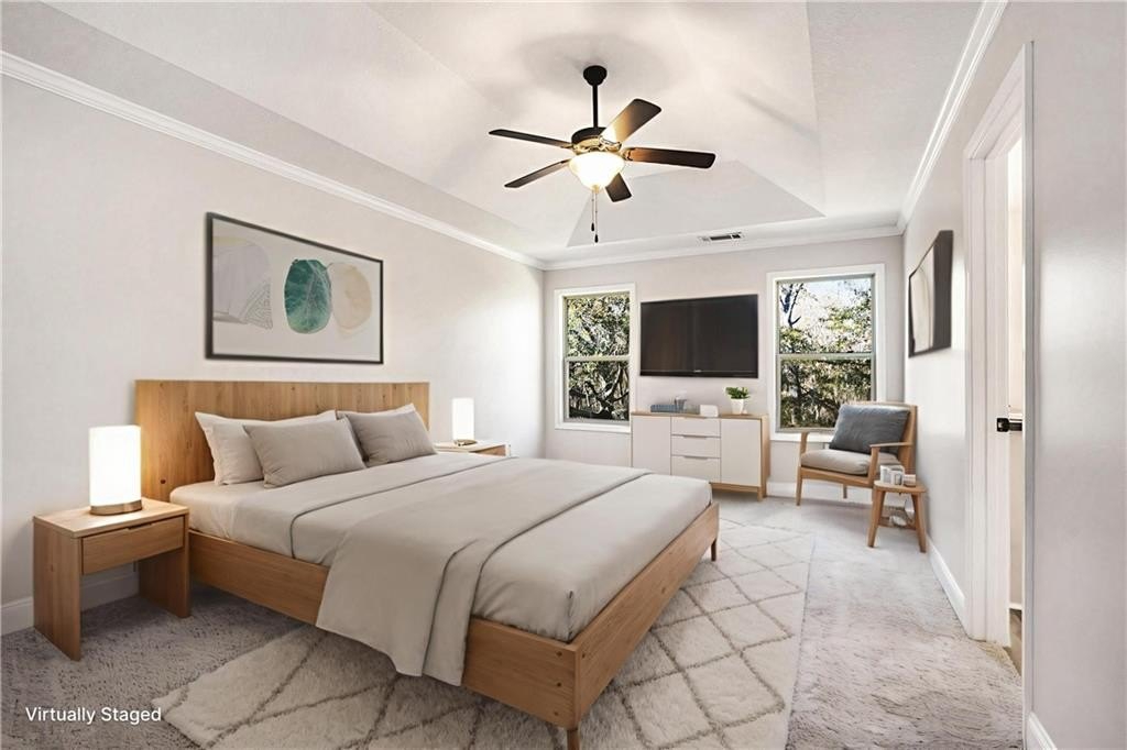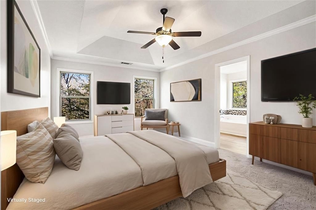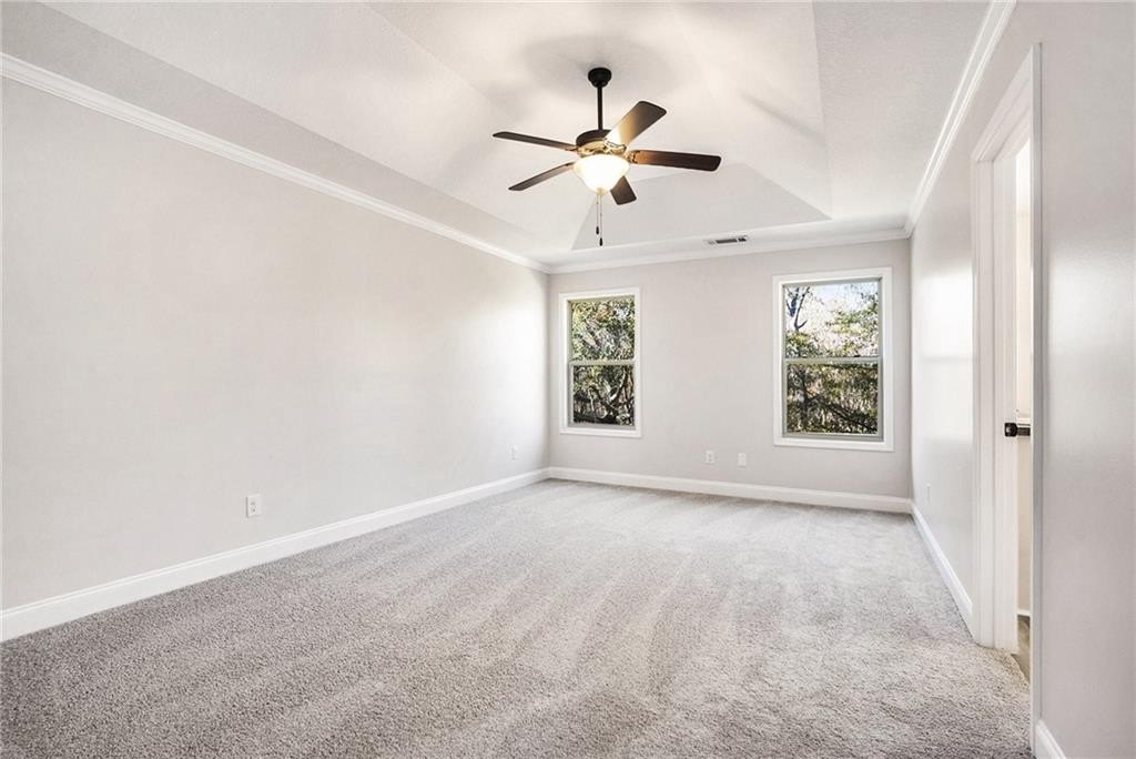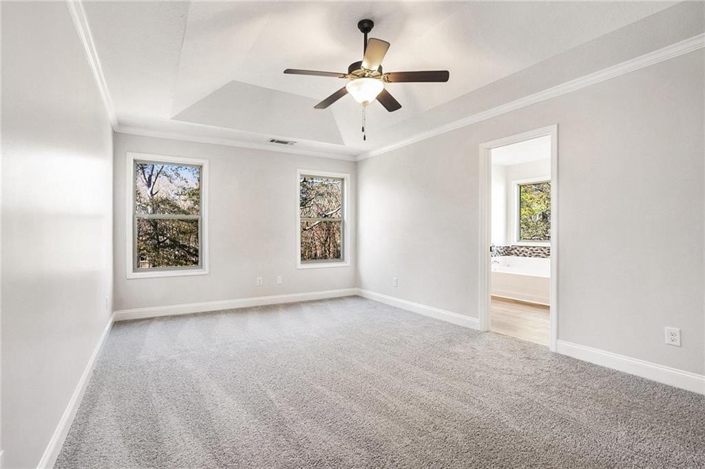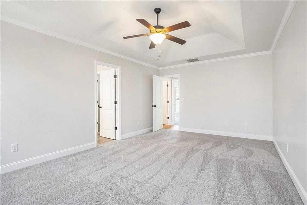 The primary suite is located on the upper level and includes a tray ceiling, walk-in closet, and a spacious private bath with