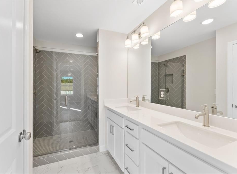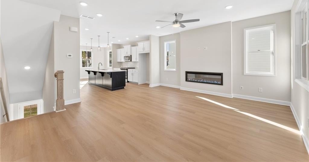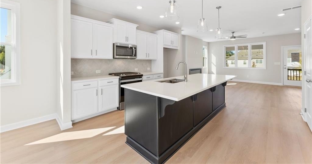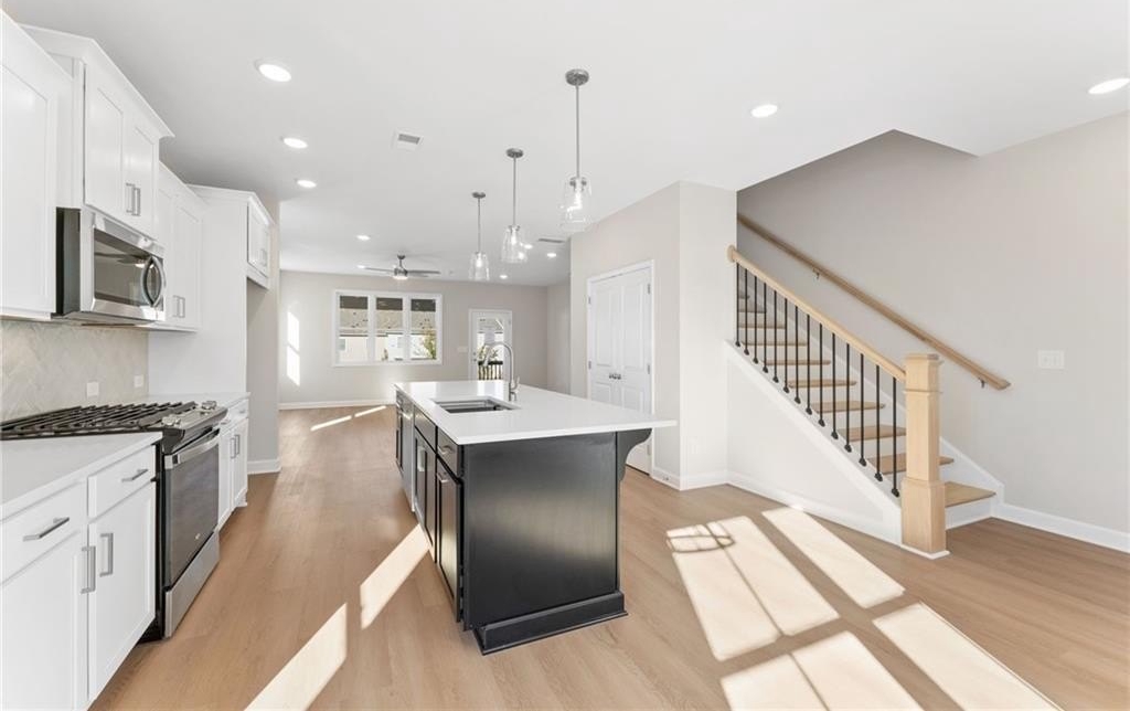 TRATON HOMES KAUFMAN "A" END UNIT FLOORPLAN IS READY NOW! Traton incentive of $5,000 any way you want and up to $10,000 towards closing costs with one of Traton's approved lenders on contracts written by 11/30/2025. All applicants must prequalify with a Traton preferred lender regardless of who you choose for your loan. This beautiful three-story end unit features a rear-entry two-car garage, a large ground-floor bedroom/office, and an attached full bath—ideal for a peaceful workspace or accommodating guests. Hardwood stairs lead to the main level, where you'll find a spacious open-concept kitchen equipped with shaker cabinets, quartz countertops, gas cooking, a large island that comfortably seats four, and a generous pantry. The expansive family room includes a sleek, modern electric fireplace that can provide heat or simply create a cozy ambiance. Windows flanking the fireplace bring a cozy charm to the room and add so much natural light! You'll also find a separate dining room and a half bath on this level. The family room opens to a large, covered deck, perfect for entertaining, grilling, or watching the game in the shade. Hardwood stairs lead upstairs where you'll discover the king-sized owner's suite, complete with a double vanity and a large shower with a bench and a custom closet system. A secondary bedroom suite on the opposite end of the upper level ensures complete privacy. Laundry is upstairs for convenience. East Park Village checks all the boxes! Its prime location is close to I-75 and downtown Kennesaw. Plus, East Park Village was voted the best neighborhood in Cobb County by Cobb Life Magazine 2024, and USA Today recognized Kennesaw as the best place to live in Georgia. Don’t miss your chance to grab your new home before the rush! Photos are representative of this home, same Kaufman floor plan. Must use Traton Preffered Lender for Incentives to Apply. DECORATED PHOTOS ARE OF MODEL.